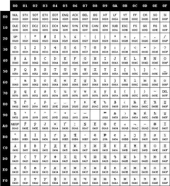 Одна из первых картинок в поисковике. Таблица 16 на 16. Под обозначением/изображением символа его код в Unicode.