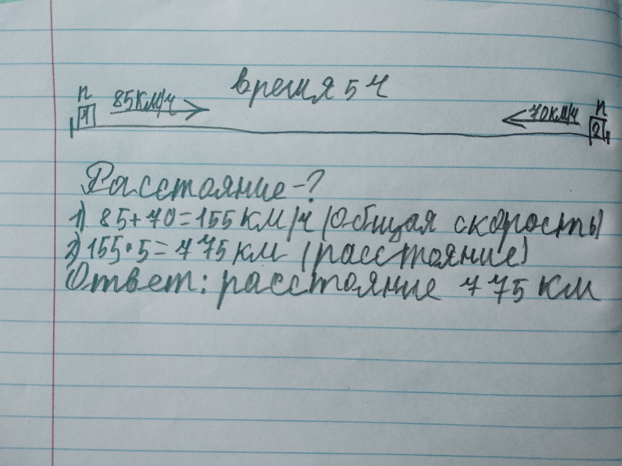 Из двух городов навстречу друг другу вышли два поезда Скорость первого 85 км ч второго 70 км час Поезда встретились через 5 часов Найди расстояние между городами какое расстояние было между поездами