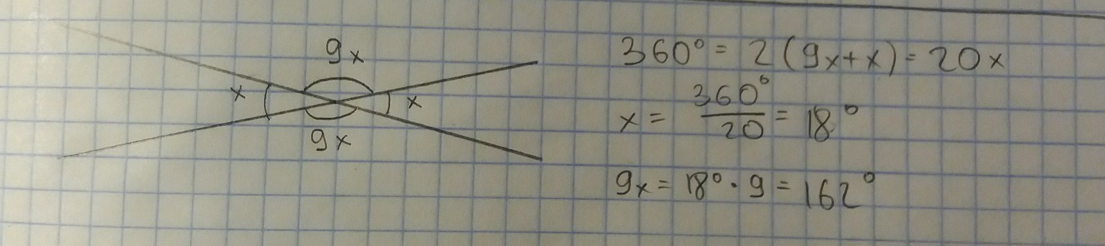 Один из углов который образуется при пересечении двух прямых в 9 раз больше другого.Найдите все 4 угла