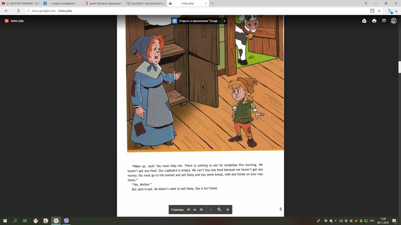"Вставай (в значении проснись), Джек! Ты должен помочь мне. Нам нечего есть на завтрак. У нас вообще нет еды. Наш буфет пуст. Мы не можем купить еды, потому что у нас нет денег. Ты должен пойти на рынок и продать Дейзи (или Маргаритку) и купить немного хлеба, молока и меда по дороге домой."