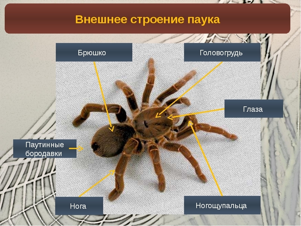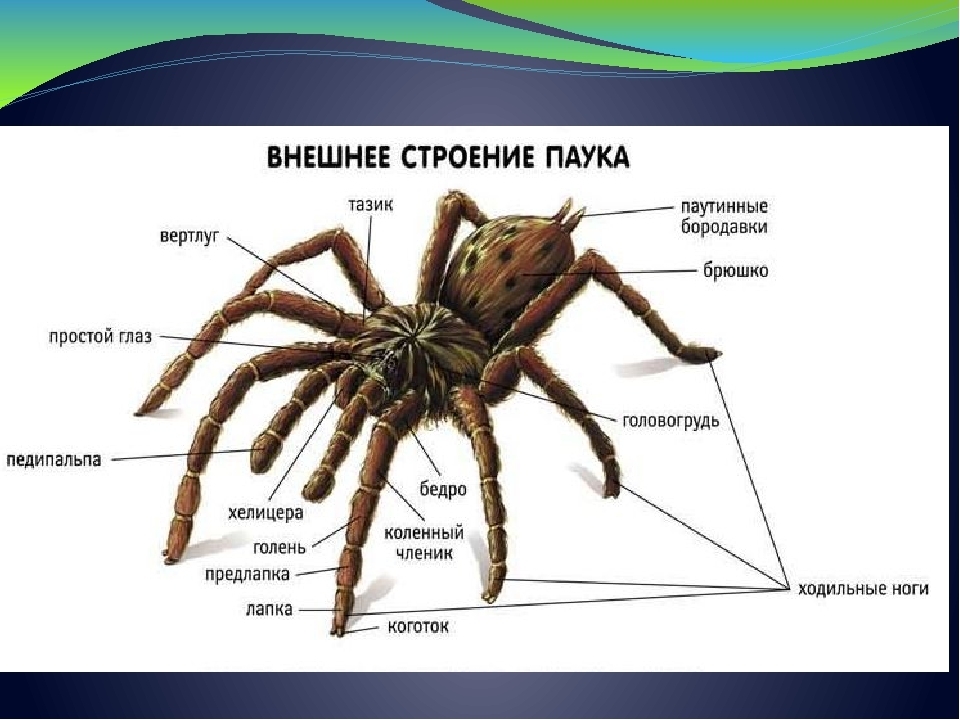 Пауки — очень древние членистоногие. Плотная внешняя оболочка тельца содержит углевод хитин — вещество, характеризующее тип членистоногих.