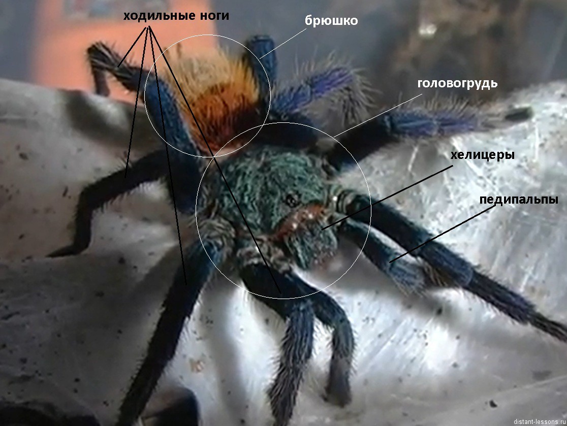 Тело: состоит из двух отделов: головогрудь и брюшко. От головогруди отходят конечности: