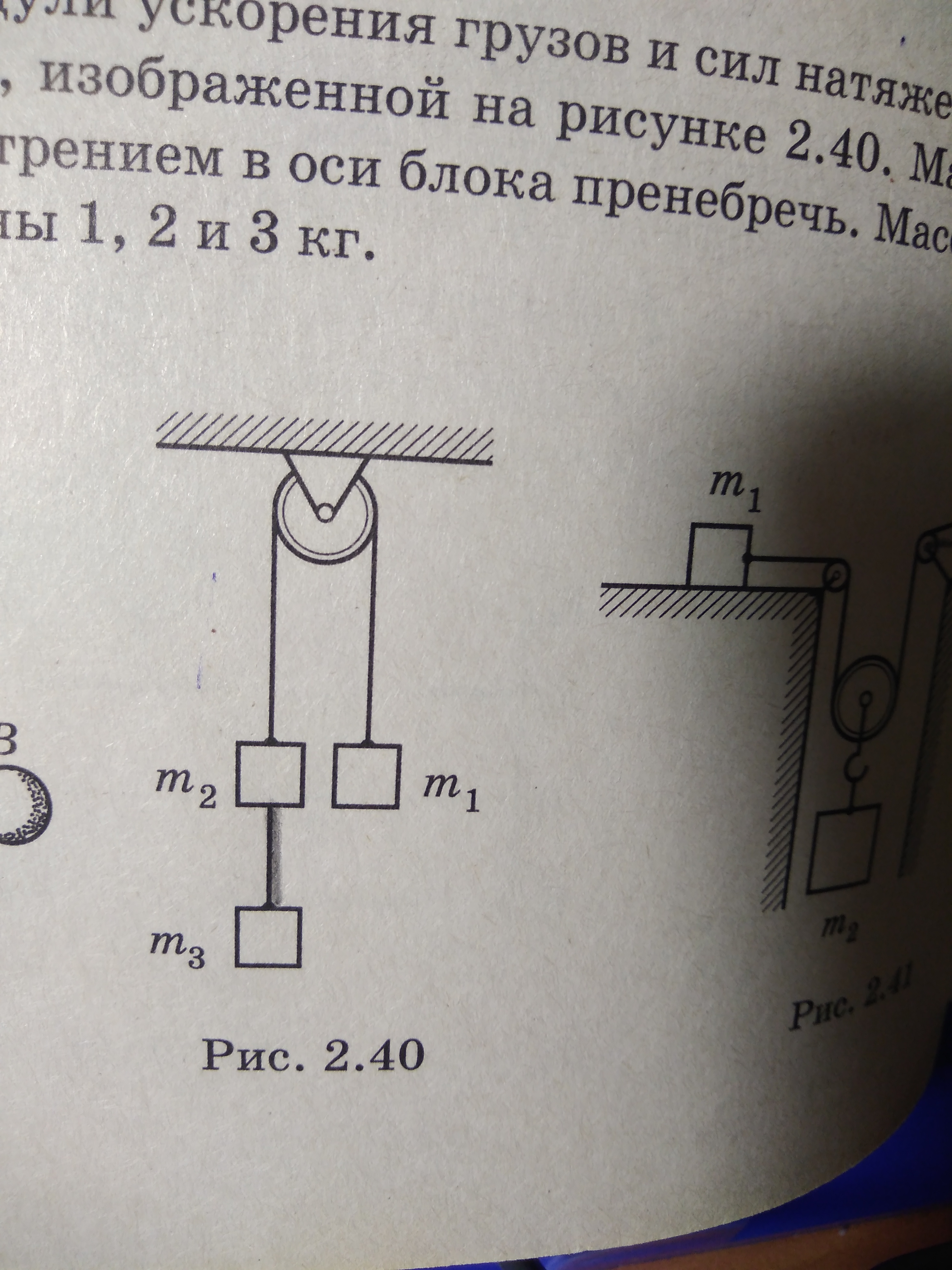 ПОМОГИТЕ ПОЖАЛУЙСТА !! Найдите модуль ускорения грузов и сил натяжения нитей для системы грузов изображенной рисунке ,массой нити и блока,а также трением в оси блока пренебречь . массы грузов соответственно равны 1, 2 и 3 кг