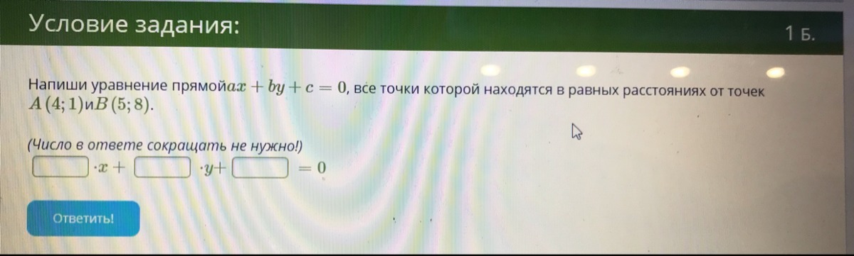 напиши уравнение прямой ах+бу+с=0, все точки которой находятся в равных расстояниях от точек А(4;1) и В(5;8)
