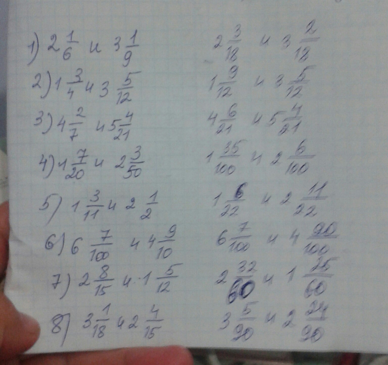 задание 463. Приведите смешанные числа к наименьшому общему знаменателю: 1) 2 1/6 и 3 1/9 2) 1 3/4 и 3 5/12 3) 4 2/7 и 5 4/21 4) 1 7/20 и 2 3/50 5) 1 3/11 и 2 1/2 6) 6 7/100 и 4 9/10 7) 2 8/15 и 1 5/12 8) 3 1/18 и 2 4/15.Пожалуйста помогите!!!