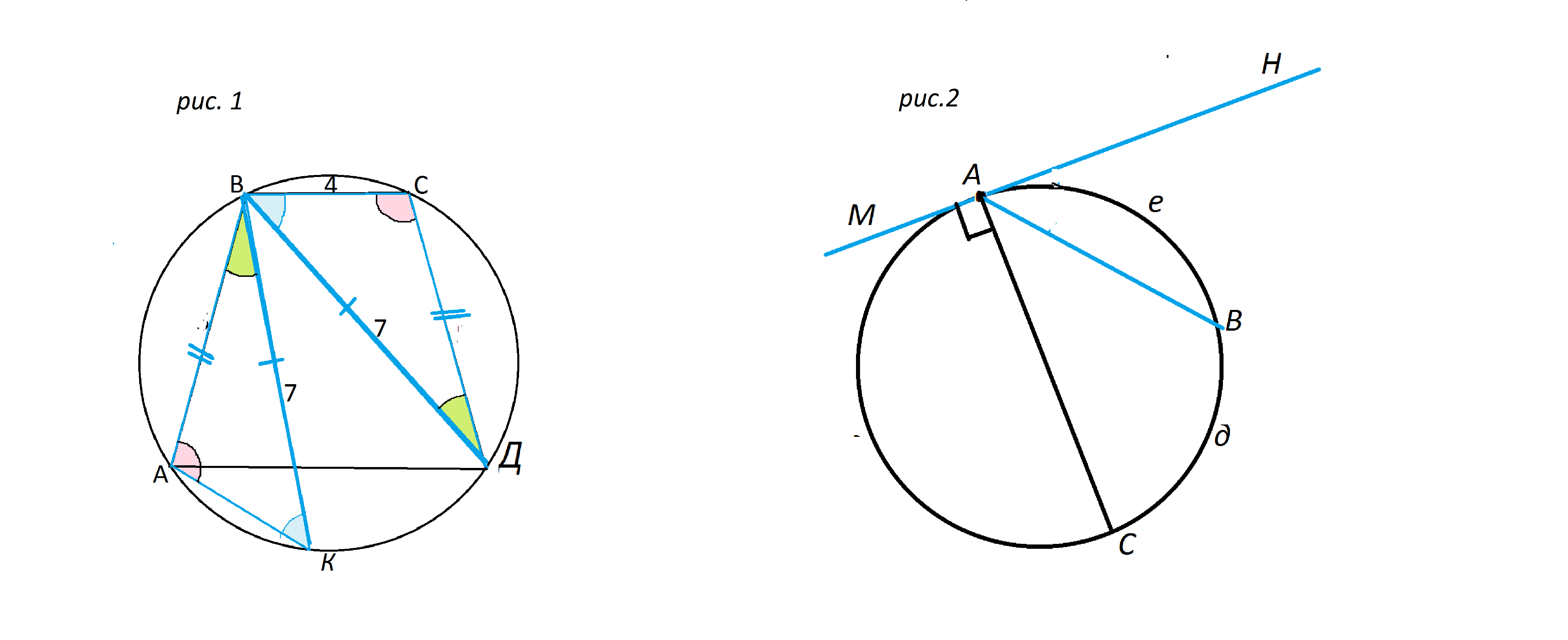 Вписанные углы АКВ и СВД опираются на равные дуги и потому равны.