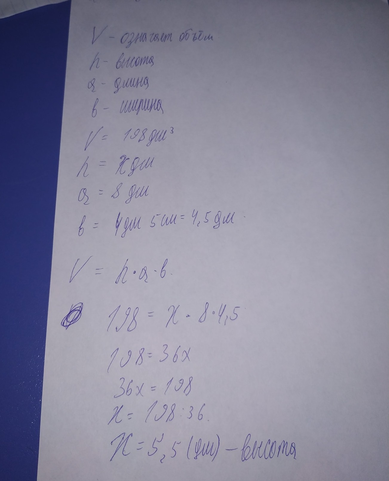 Объём аквариума равен 198 кубическим дециметрам. Найдите высоту аквариума, если известно что его длина равна 8 дециметрам, а ширина 4 дециметра и 5 сантиметров.
