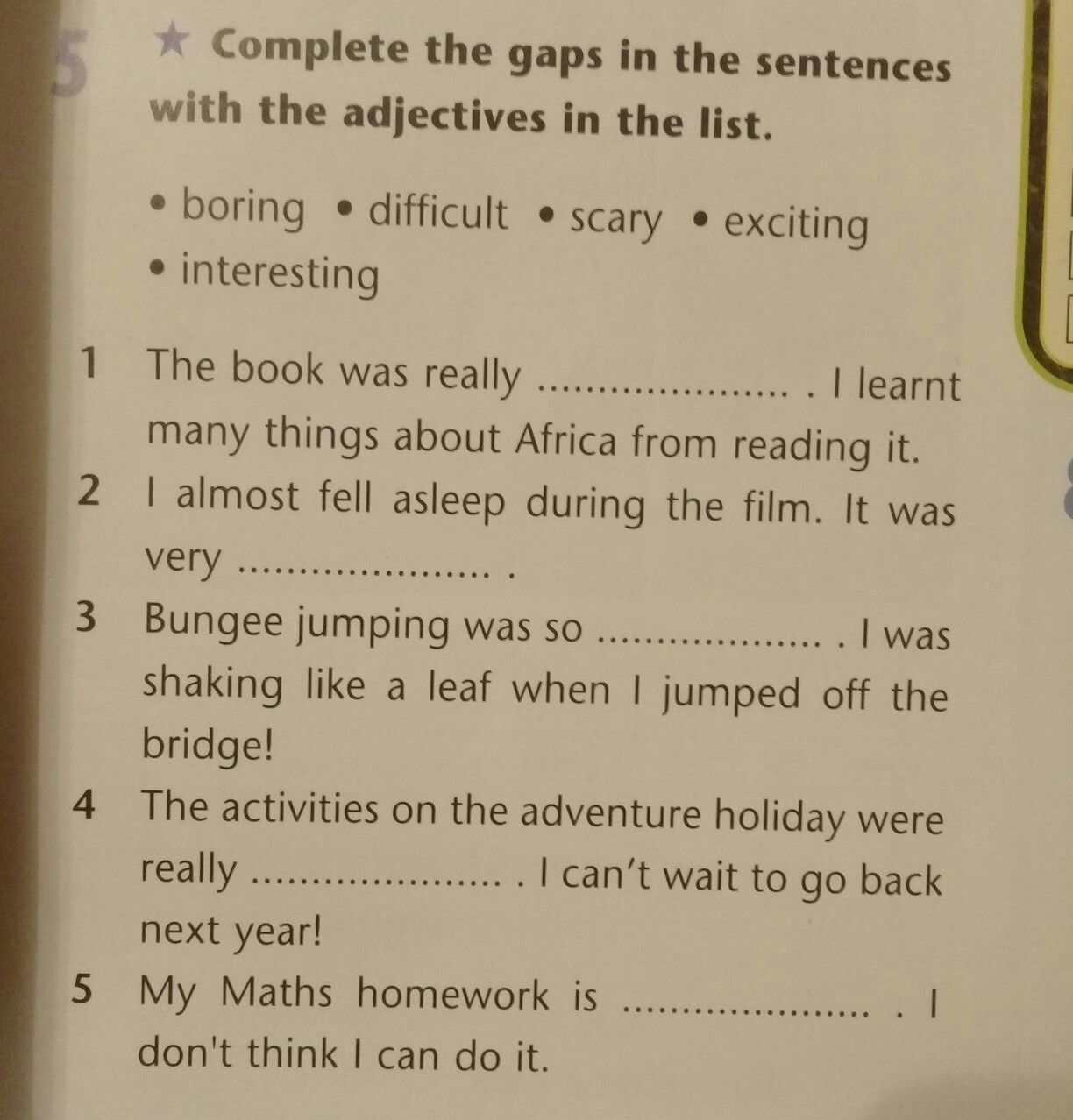 1. interesting 2. boring 3. scary 4. exciting 5. difficult