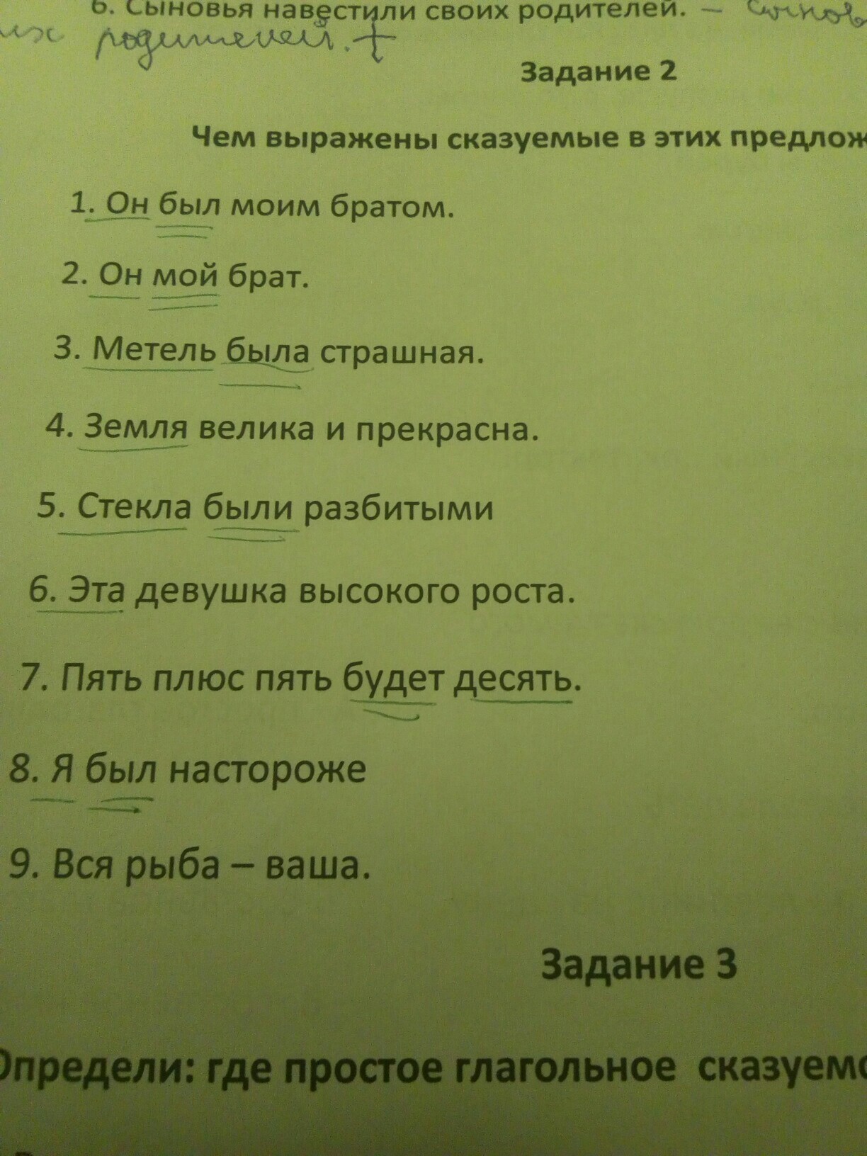 1. глагол, 2. местоимение, 3. глагол, 4. прилагательное, 5. глагол, 6. нет сказуемого. 7. глагол, 8. глагол, 9. местоименое