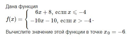 вычисление ведем по верхней формуле ( так как -6<-4). получаем: f(-6)=6*(-6)+8= -36+8= -28. Ответ: f(-6)= -28.