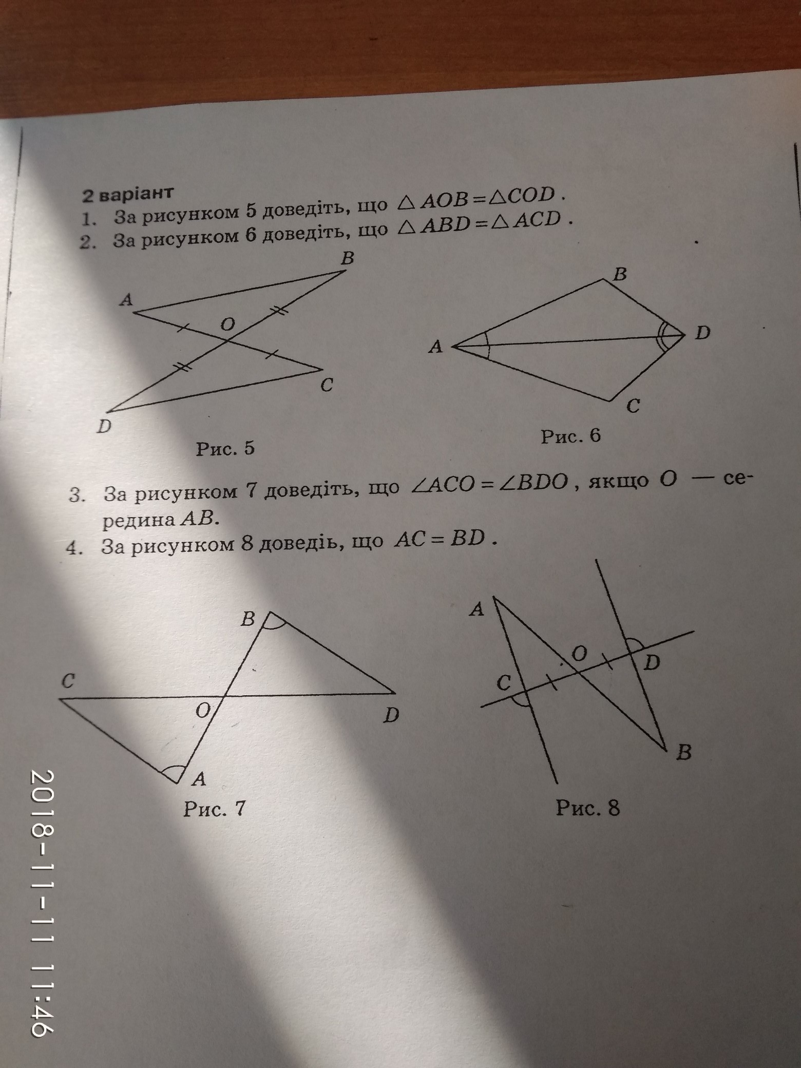 Напишу по русски, но это не страшно, Номер 1, АО=СО, ВО=DO угол АОВ=УГЛУ DOC ( так как они вертикальные, следовательго треугольники равны по первому признаку равенства треугольников. Номер 2. Угол ВАD= УГЛУ САD. УГОЛ ВDA= УГЛУ СDA. AD - общая сторона, сдедовательно треугольники равны по 2 признаку. Номер 3. Рассмотрим 2 трекгольника на этом рисунке, УГОЛ А= УГЛК В, АО=ОВ ПО УСЛОВИЮ. УГОЛ СОА= УГЛУ ВОD ( как вертикальнве углы) следовательно треугольники равны по 2 признаку и углы заданные в задаче равны.