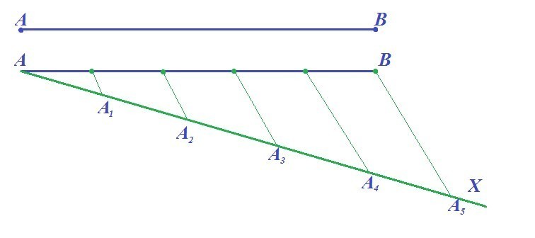 1) Проведем луч АХ, не лежащий на прямой АВ, и на нем от точки А отложим последовательно 5 равных отрезков АА1, А1А2, А2А3, А3А4, А4А5 т. е. столько