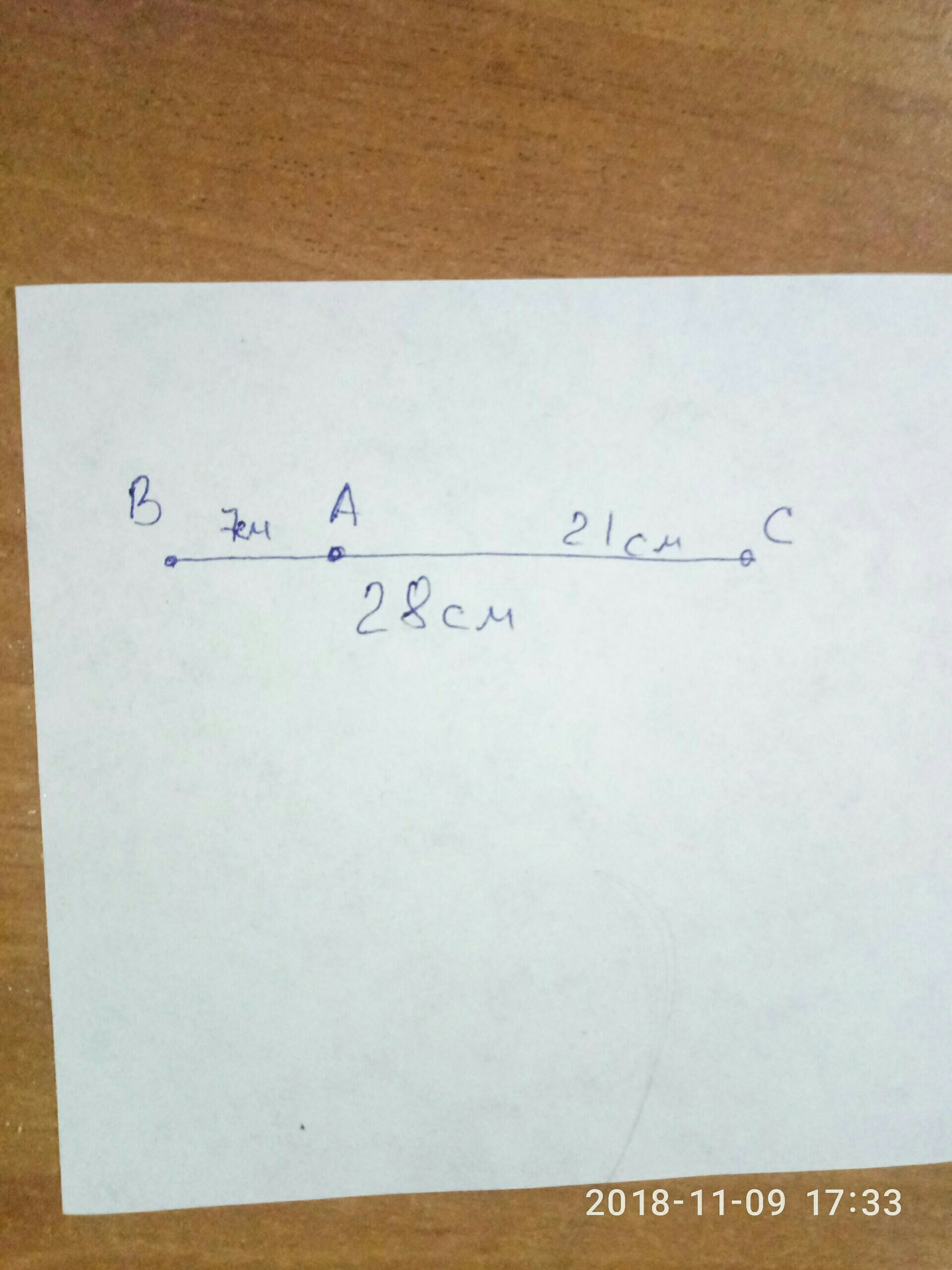 На прямой отмечены точки A,B,C так,что AB=7 см.AC=21м.BC=28см.Какая из этих точек лежит между двумя другими?
