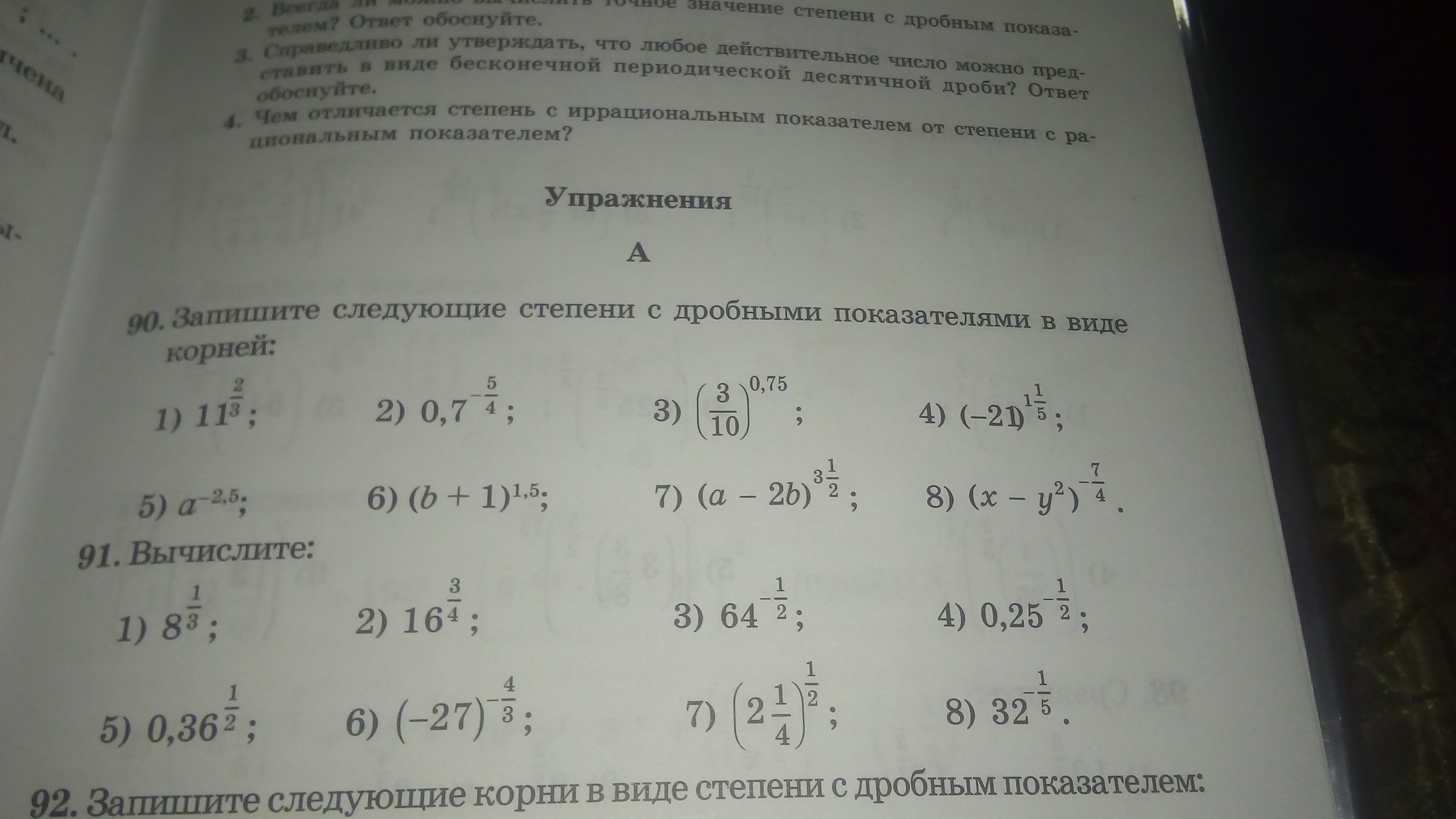 11^{frac{2}{3} } = sqrt[3]{121} \(0,7)^{-frac{5}{4}} = (frac{7}{10})^{- frac{5}{4} } = (frac{10}{7})^{ frac{5}{4}} = sqrt[4]{(frac{10}{7})^{5}} \(frac{3}{10} )^{0,75} =(frac{3}{10} )^{frac{3}{4} } = sqrt[4]{( frac{3}{10})^{3}}\(-21)^{frac{6}{5}  =  sqrt[5]{(-21)^{6}}\\ a^{-2,5} = a^{-frac{5}{2}} =  sqrt{frac{1}{a^{5}}}\  (b+1)^{1,5} = (b+1)^{frac{3}{2}} = sqrt{(b+1)^{3}}\ (a-2b)^{frac{7}{2}} =  sqrt{(a-2b)^{7}}\