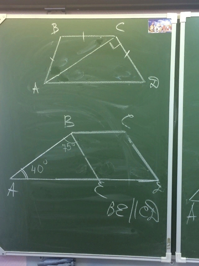 В трапеции АВСД проведен отрезок ВЕ так, что он делит трапецию на параллелограмм ВСДЕ и треуг. АВЕ. Рассмотрим треуг. АВЕ. В нем известно два угла - угол ВАС и угол АВЕ, значит мы можем найти третий угол - АЕВ и равен он будет 180-(40+75) = 65*. Но угол АЕВ - часть развернутого угла АЕД и значит мы можем найти угол ВЕД и равен он будет 180-65 = 115*. Но угол СВЕ = углу ВЕА как накрест лежащие углы при пересечении параллельных с отрезками ВС и АД. Значит угол СВЕ тоже будет равен 65*. А в параллелограмме противоположные углы равны и, т.о. угол Д тоже будет равен 65*.