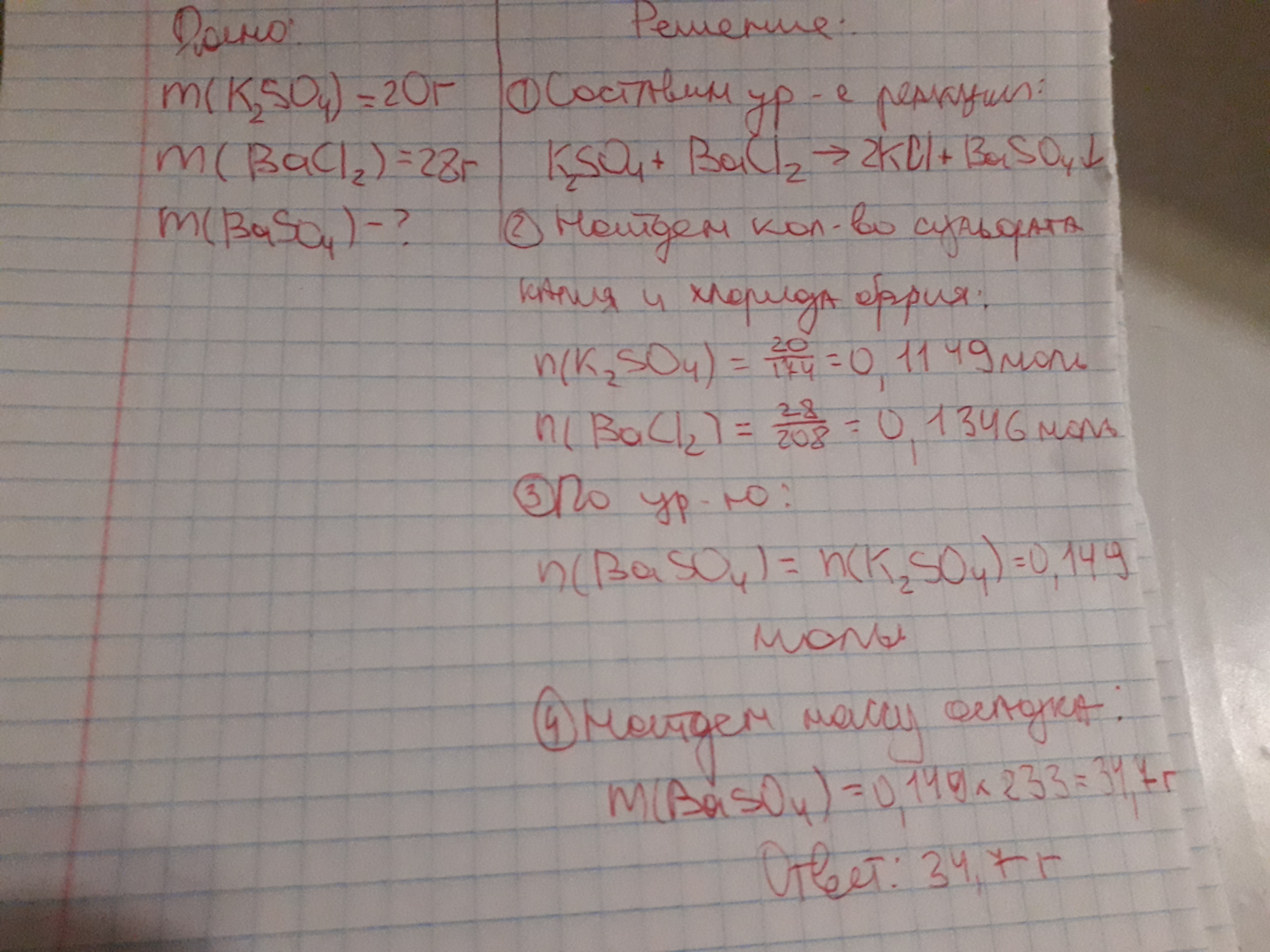 к раствору сульфата калия массой 20 г долили хлорид бария массой 28 г осадок отфильтровали что останется в фильтре