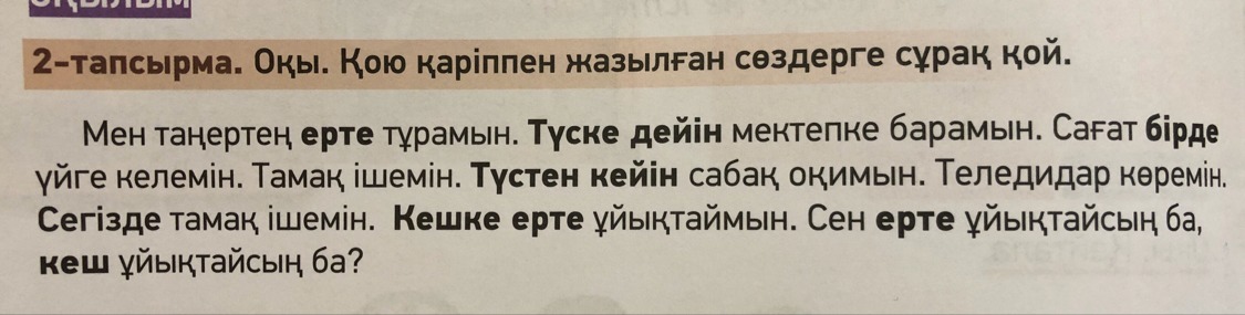 Сен таңертең ерте тұрасың.Түске дейін мектепке барасың.Сағат бірде үлгерді келесің.Тамақ ішесің.Түстен кейін сабақ оқисын. Теледидар көресің.Сегізде тамақ ішесің.Кешке ерте ұйықтайсың. Сен ерте ұйықтайсың ба, кеш ұйыйсың ба?