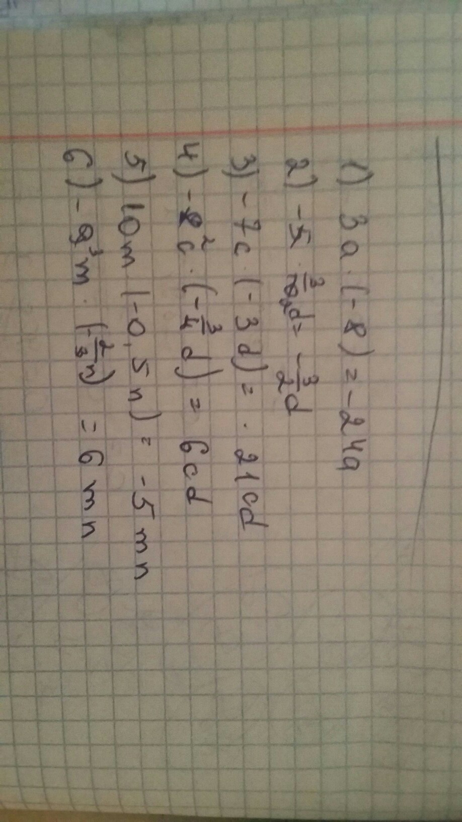 5) 10m * (-0,5n)= -5mn