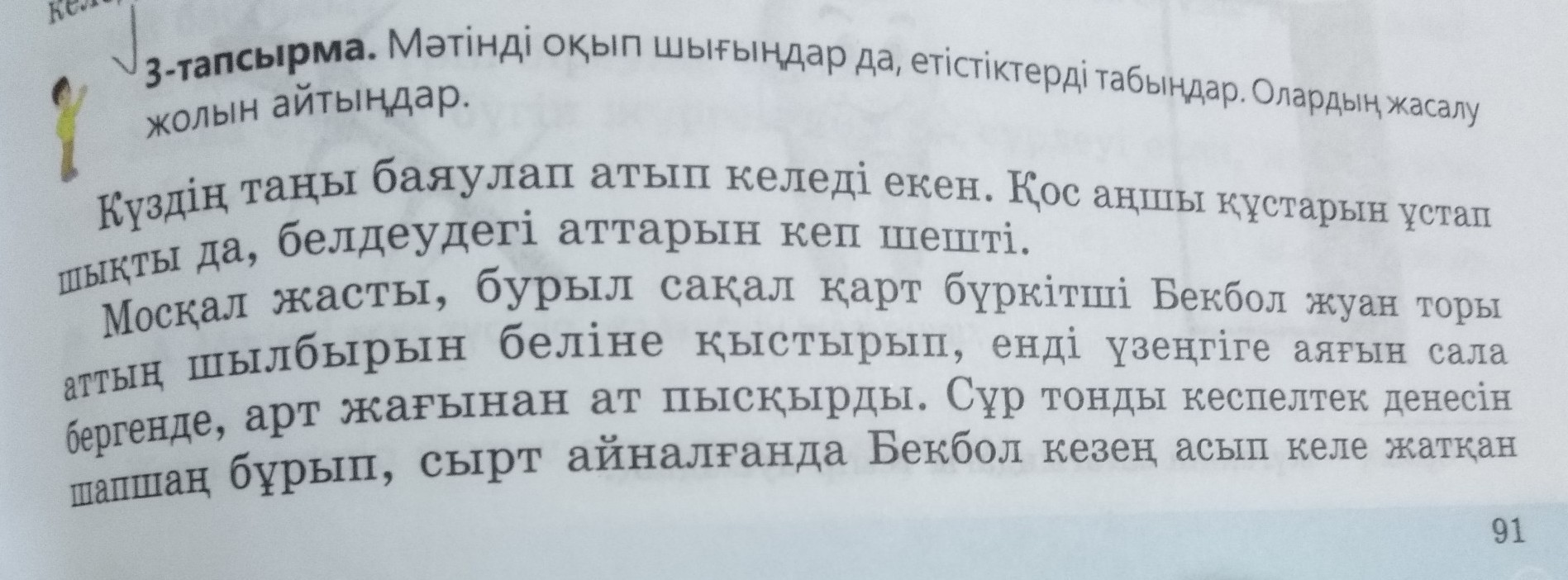 2. Күрделі етістік: баяулап атып келеді екен; ұстап шықты; кеп шешті; қыстырып, сала бергенде, асып келе жатқан еді.