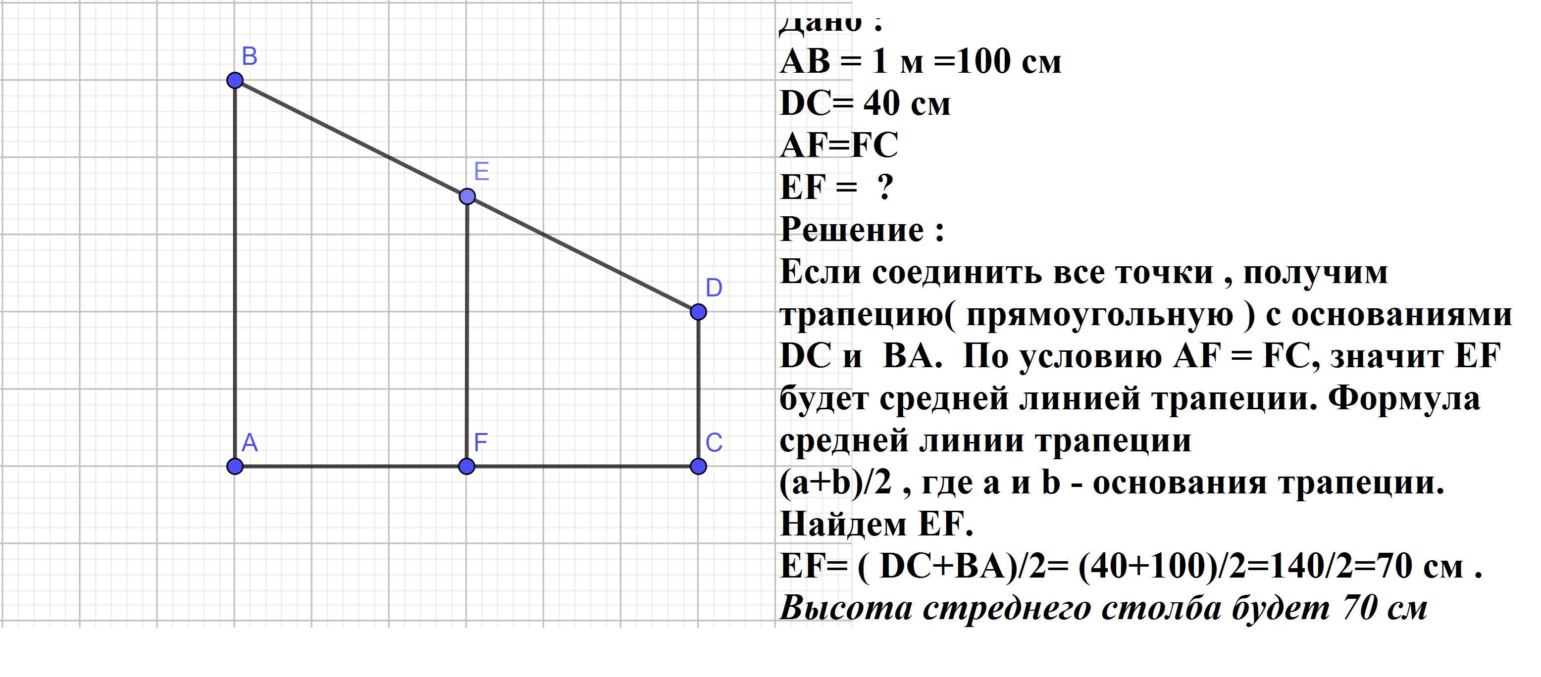 Наклонная балка поддерживается тремя вертикальными столбами находящимися на равном расстоянии друг от друга.Длины самого большого и самого маленького столбов равны 1м и 40 см соответственно. Найдите длину среднего столба. Ответ запишите в сантиметрах . GumiAlm