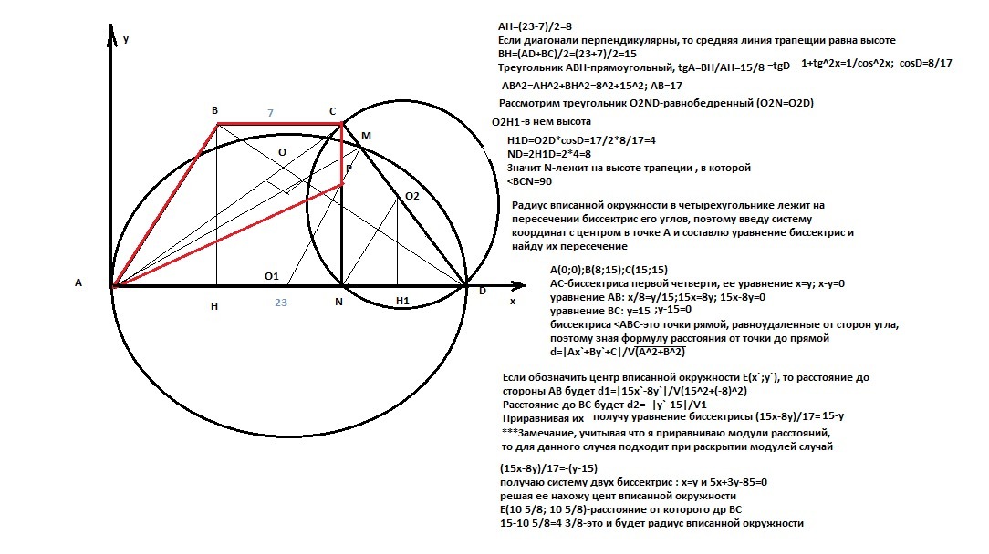 б) Найдите радиус этой окружности, если BC=7, AD=23.