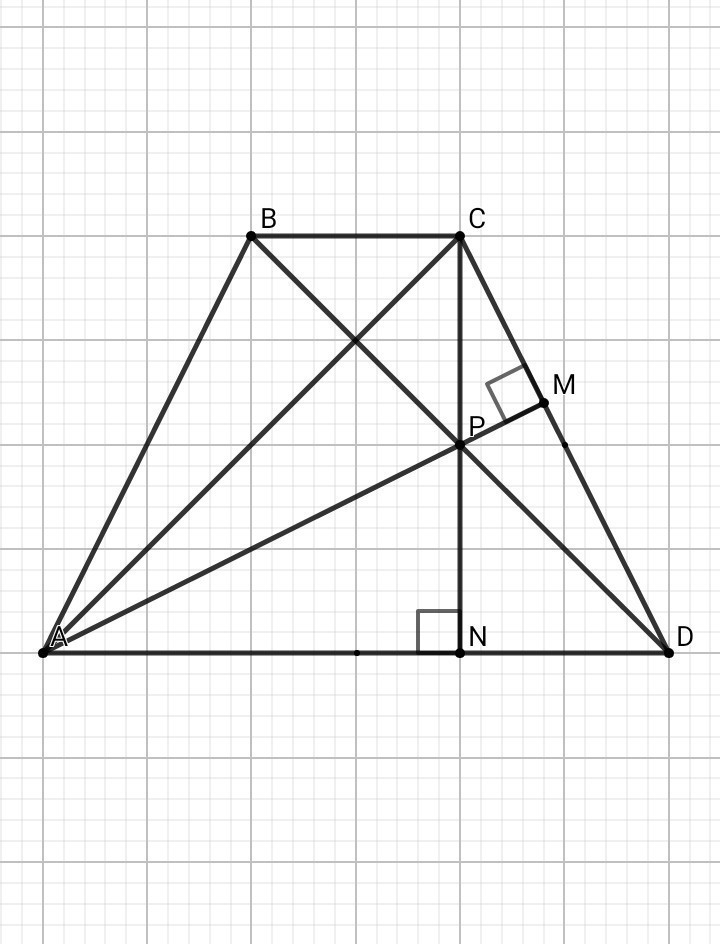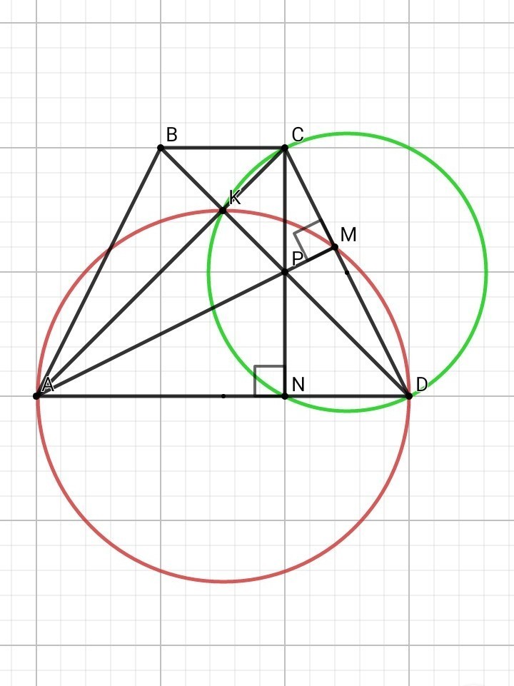 Диагонали равнобедренной трапеции ABCD с основаниями BC и AD перпендикулярны. Окружность с диаметром AD пересекает боковую сторону CD в точке M, а окружность с диаметром CD пересекает основание AD в точке N. Отрезки AM и CN пересекаются в точке P.