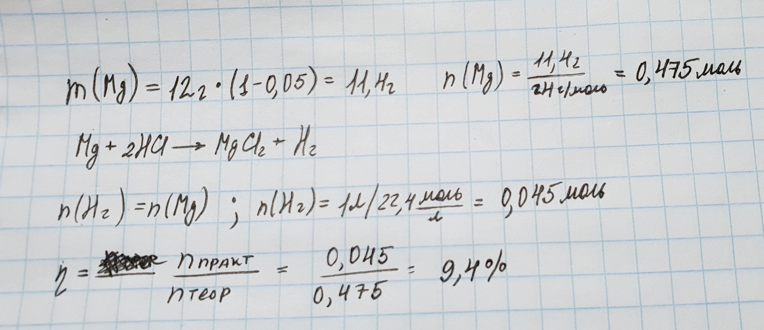 при взаимодействии 12 г Магния содержащий 5% примесей избыток соляной кислоты выделил 1 л Водорода (н.у) вычислите объем доли выхода продукта реакций