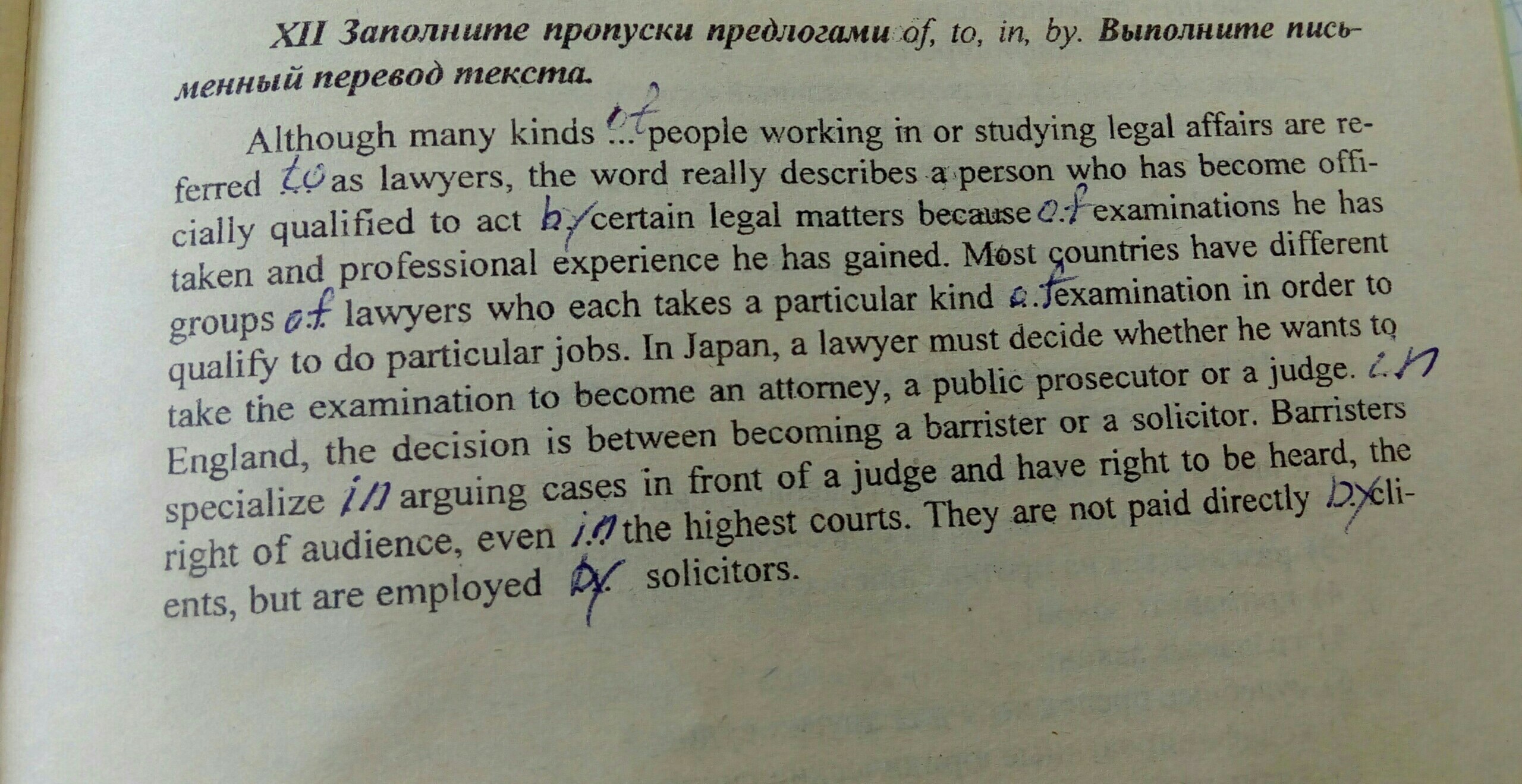 Although many kinds of people working in or studying legal affairs are referred to as lawyers, the word really describes a person who has become officially qualified to act in certain legal matters because of examinations he has taken and professional experience he has gained. Most countries have different groups of lawyers who each take a particular kind of examination in order to qualify to do particular jobs. In Japan, a lawyer must decide whether he wants to take the examination to become an attorney, a public prosecutor or a judge. In England, the decision is between becoming a barrister or a solicitor. Barristersspecialize in arguing cases in front of a judge andhave the right to be heard, the right of audience, even in the highest courts. Theyare not paid directly by clients, but are employed by solicitors.
