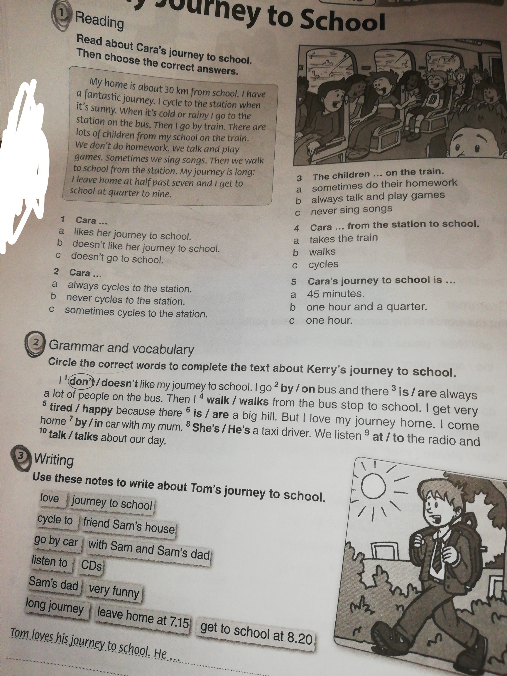 Tom loves his journey to school. Firstly, he cycles to his friend Sam's house. He certainly tries to do it when it's sunny. Then he meets his friend Sam and since they are good friends they go to school by car with Sam and Sam's dad. They like to listen to CDs in their way to school. Besides, Sam's dad is very funny, so they never get bored in the car.