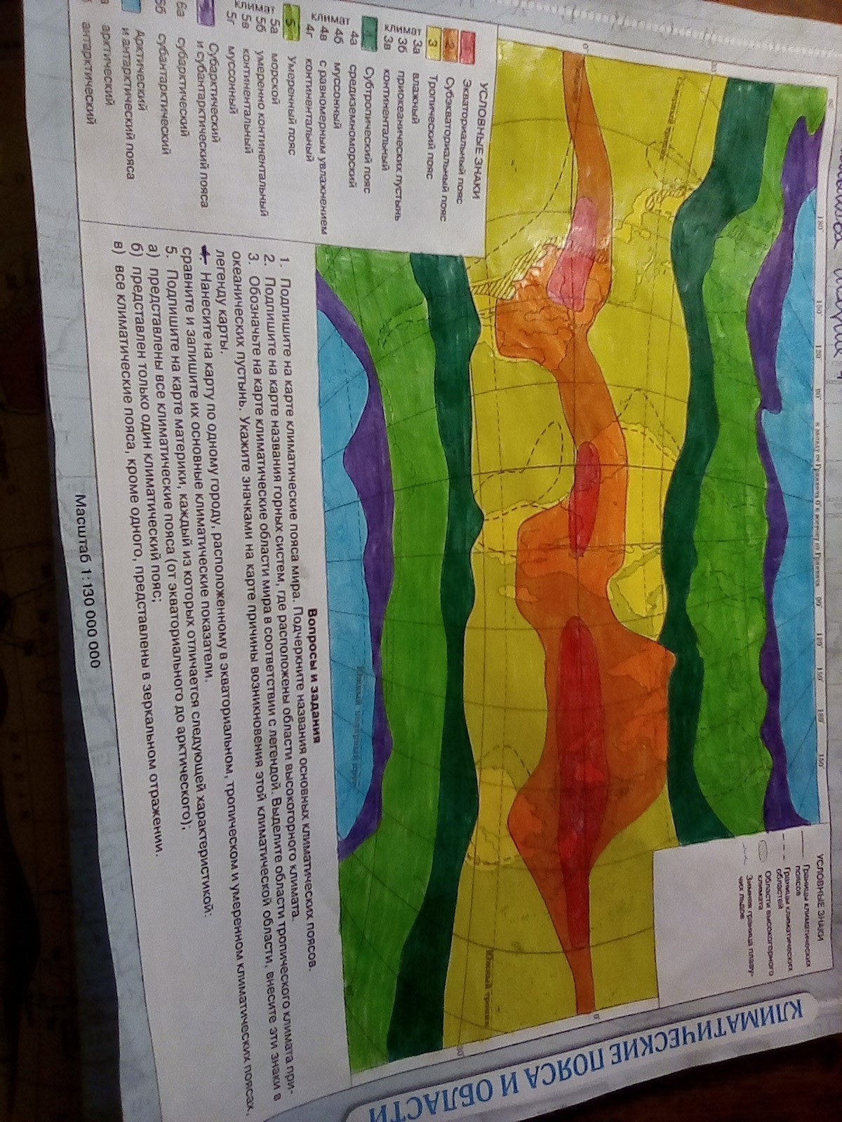 1) по условным знакам смотри , например : красный - экваториальный пояс (подпиши черной ручкой и все и подчеркни основные (экваториальный, тропический, умеренный, арктический и антарктический ) . А переходные это пояса с "суб" . Н: субэкваториальный и тд . Просто запомни .