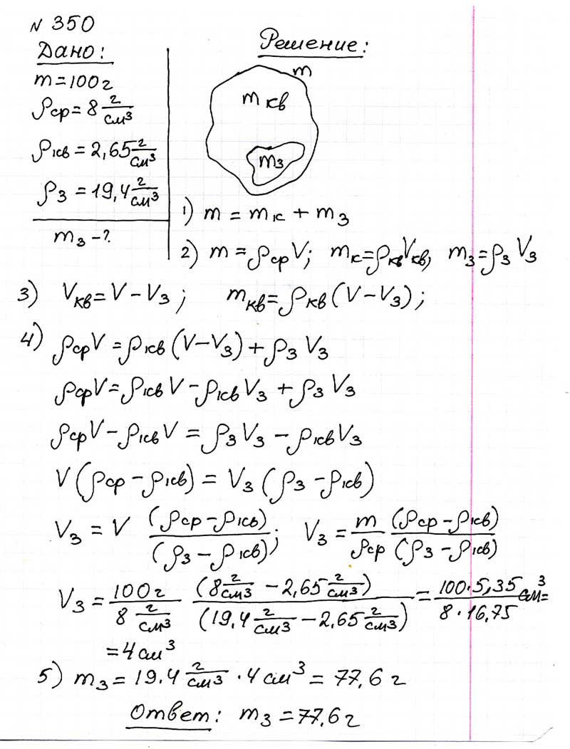 В куске кварца содержится небольшой самородок золота . масса куска равна 100г, его средняя плотность 8 г/см3. определите массу золота содержащегося в куске кварца, если плотность кварца 2,65г/см3, а плотность золота 19,4 г/см3,