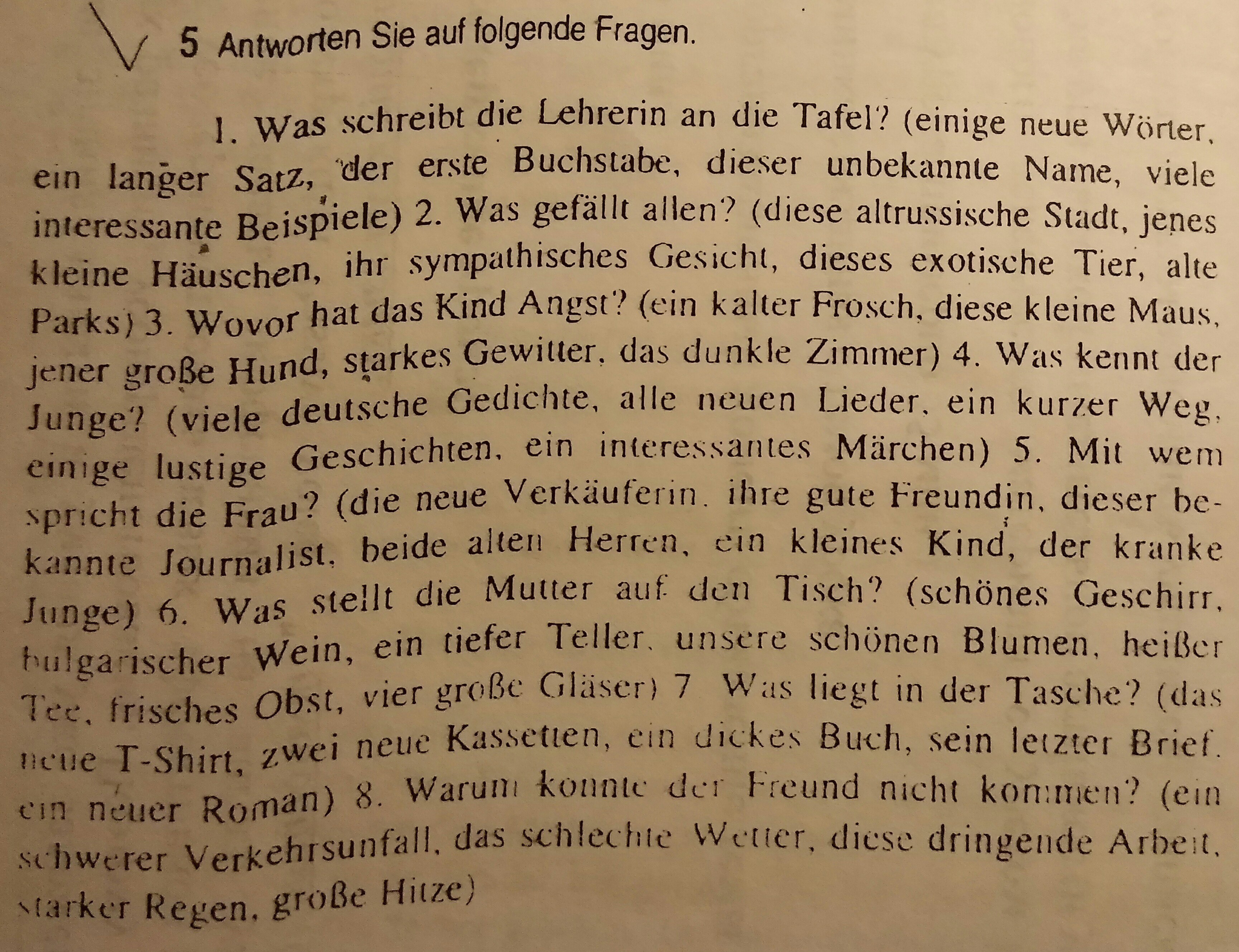 4. Der Junge kennt viele deutsche Gedichte, alle neuen Lieder, einen kurzen Weg, einige lustige Geschichten, ein interessantes Märchen.