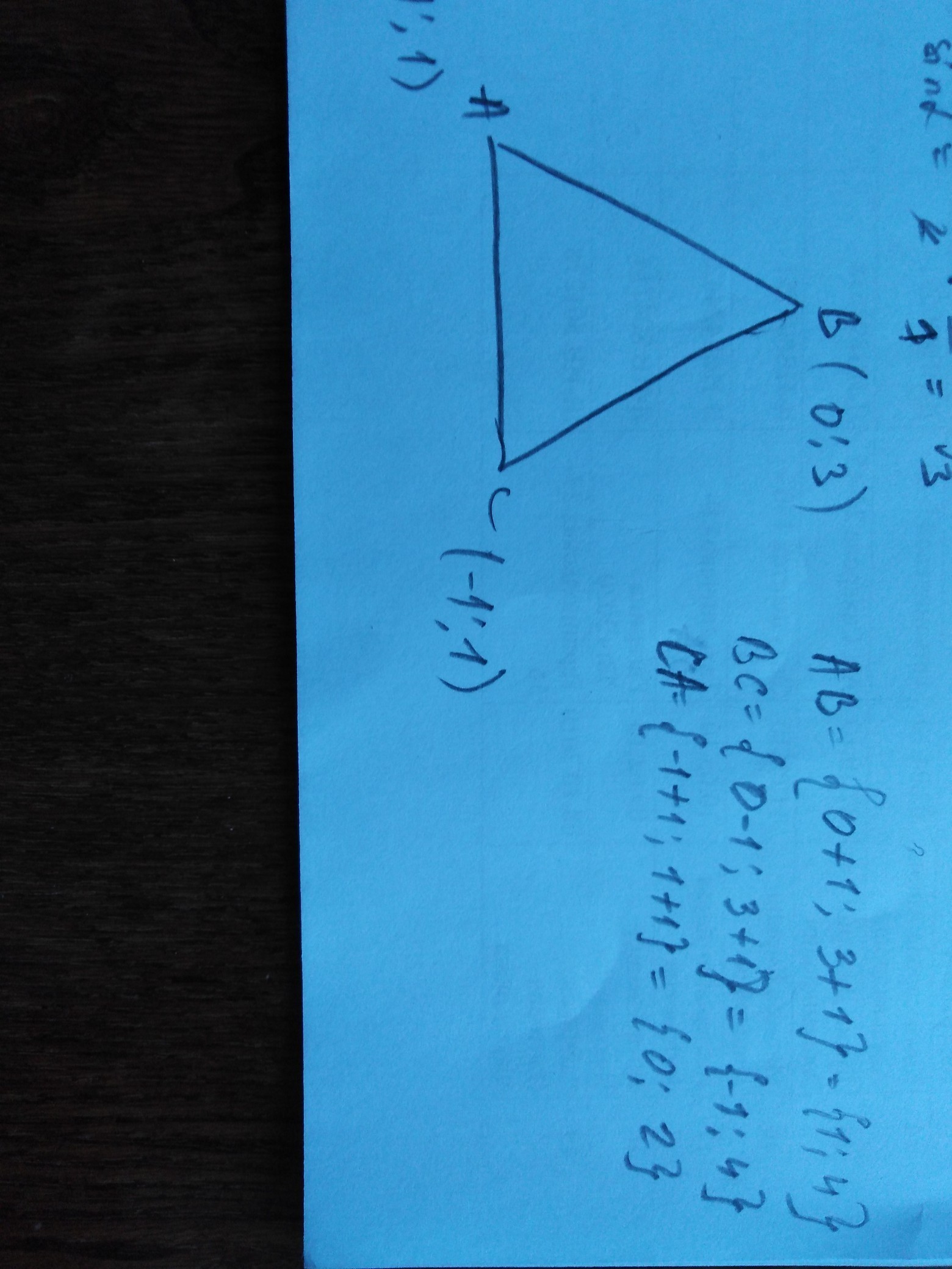 вершинами треугольника ABC являются точки A(1;1), B(0;3), C(-1;-1). Определите координаты вектора AB, BC, и CA