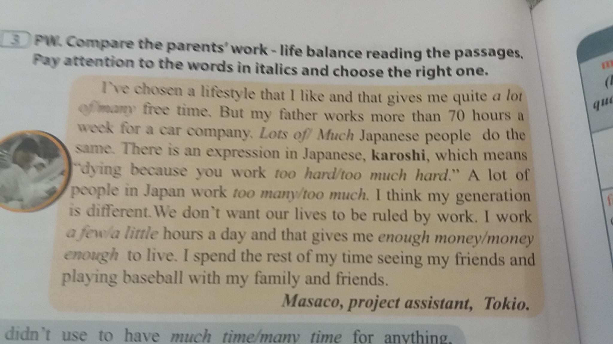 Я выбрал стиль жизни, который мне нравится и оставляет много свободного времени. Но мой папа работает больше 70 часов в неделю на машинную компанию. Большинство японцев занимаются тем же самым. Я них есть поговорка, "кароши", что означает "умерает от тяжёлой работы". В Японии многие люди очень трудолюбивые. Как мне кажется, мое поколение другое. Мы не хотим быть поглощенными работой. Я работаю пару часов в день, и мне этого достаточно для заработка. В остальное время я встречаюсь с друзьями и играю в бейсбол с семьей.