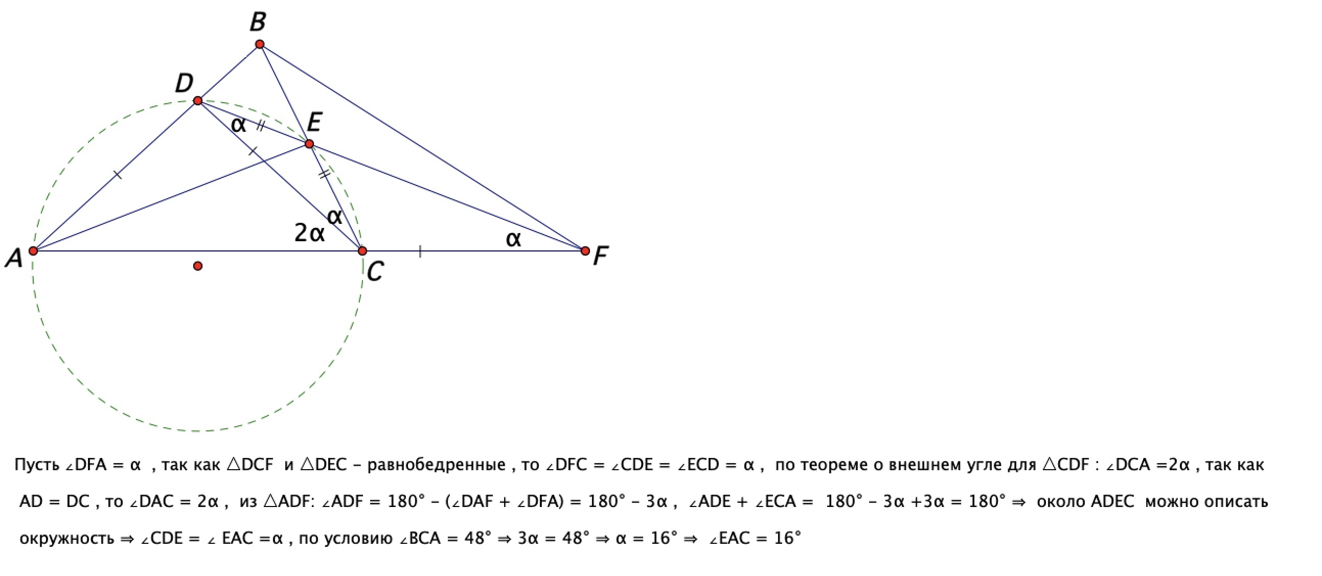 На сторонах треугольника AB и BC треугольника ABC отмечены точки D и E соответственно. Прямая DE пересекает продолжение AC за точку C в точке F. Оказалось, что AD=DC=CF, DE=EC ∠ACB=48