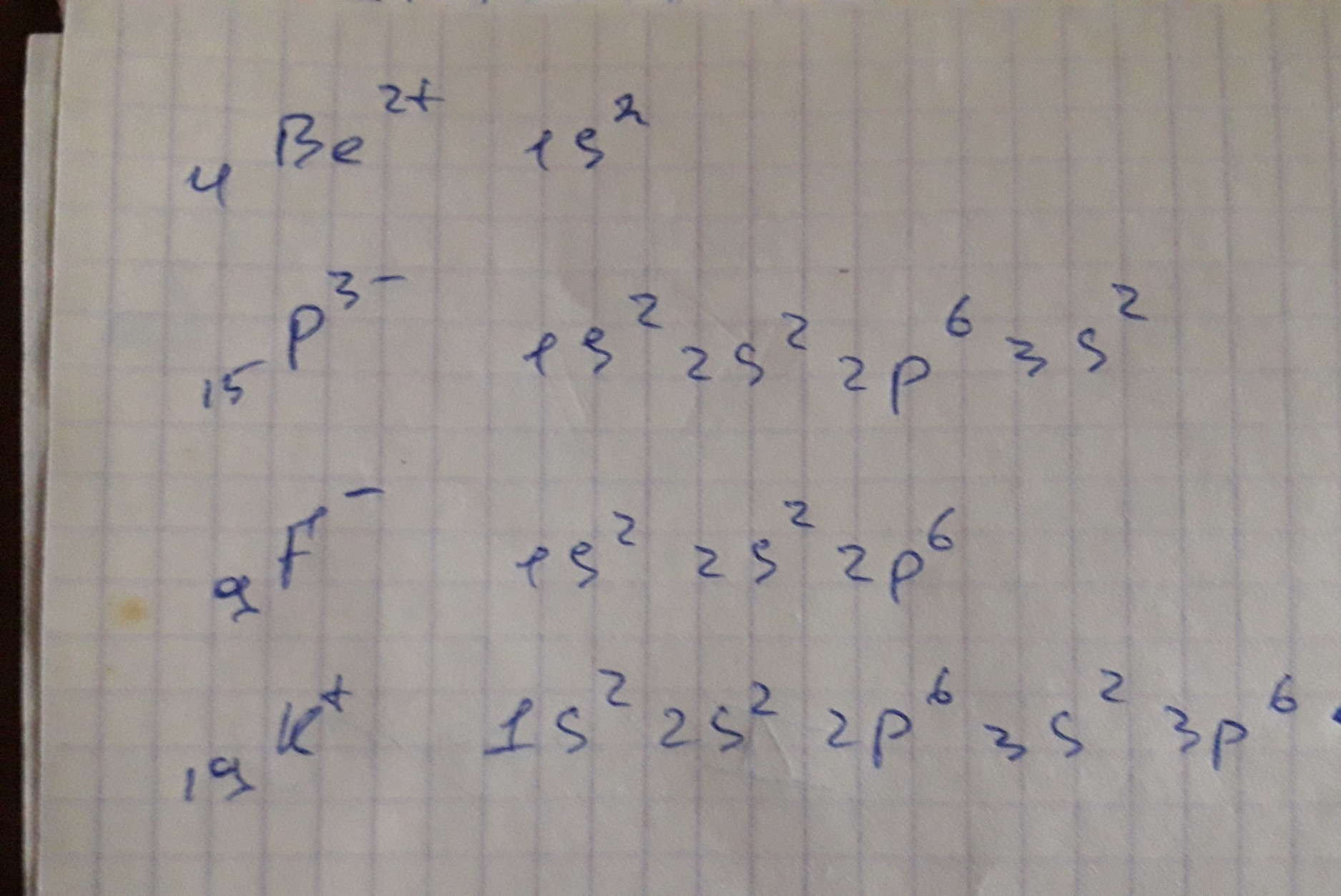 Допоможіть бо я не розумію цієї теми будь-ласка !Складіть електронні формули йонів :Be²+.P³-.F-.K+ .Плюси і мінуси мають бути також зверху.