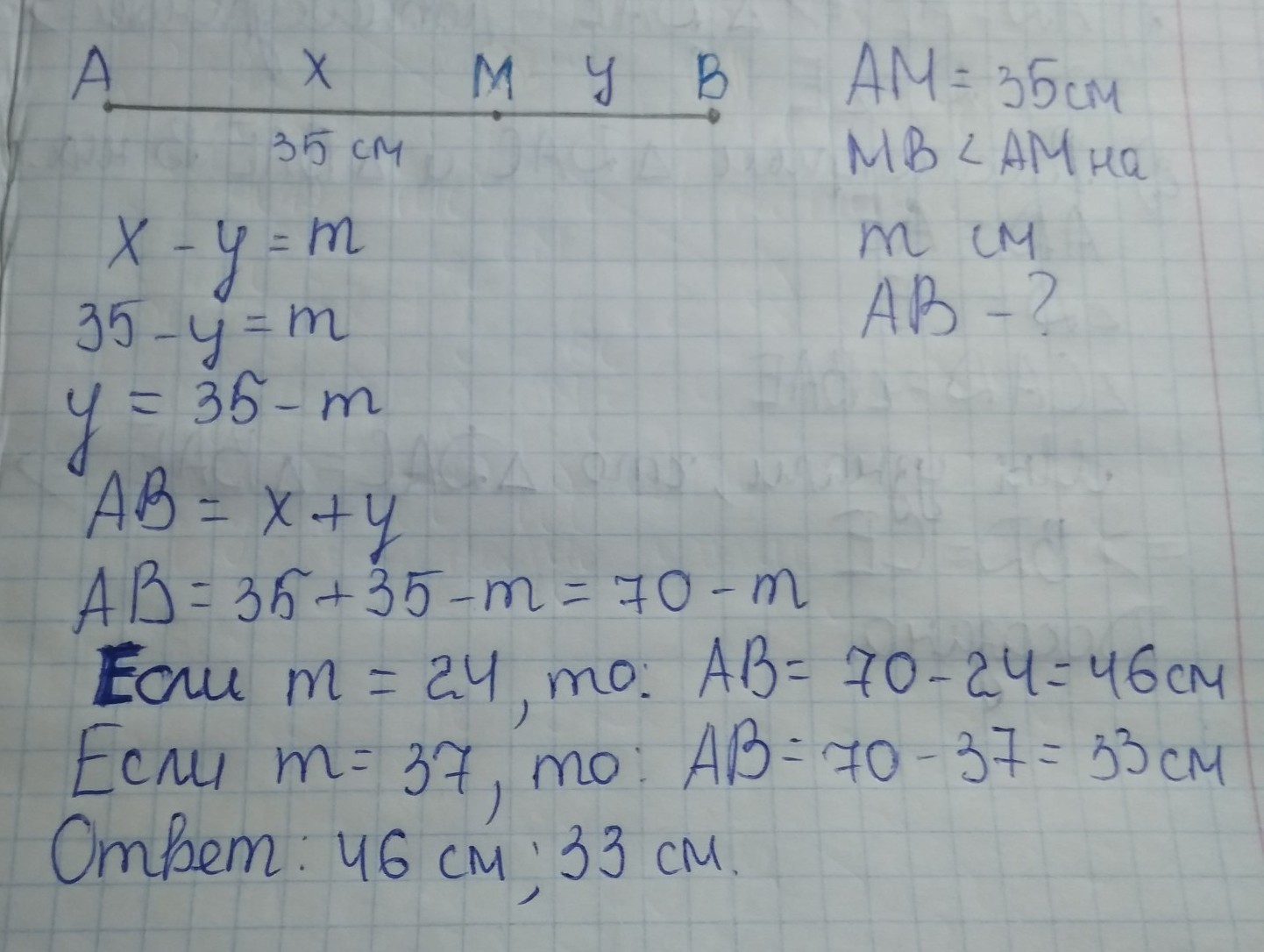 На отрезке AM отмечена точка M . Найдите длину отрезка AB , если отрезок AM равен 35 см, а отрезок MB короче AM на m см. Упростите получившиееся выражение и найдите его значение при m=24 и при m=37.