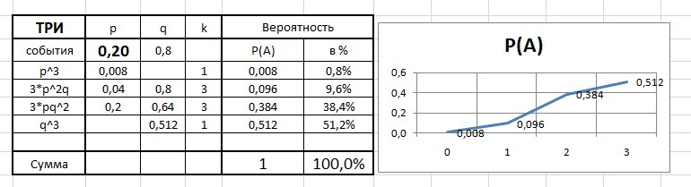 Р(3) = p³ + 3*p²*q + 3*p*q² = 0.008 + 3*0.04*0.8 + 3*0.2*0.512 =