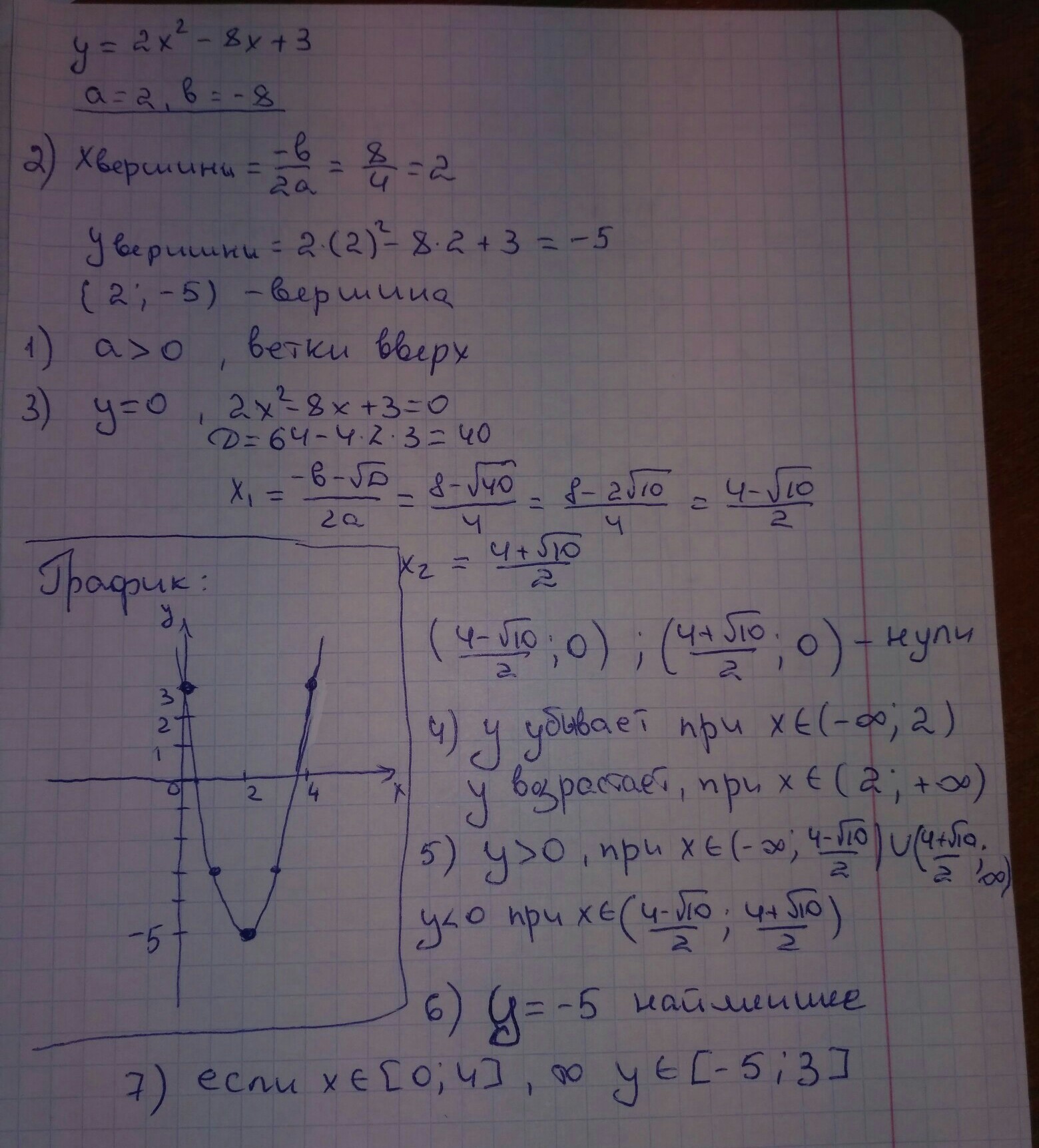 построить график функции 2х^2-8х+3 1.Направление ветвей 2.Коордитнаты вершины параболы 3. Нули функции 4.Монотонность функции (возрастание/убывание) 5. Промежутки знакопостоянства (у>0, y<0). 6.Наибольшее/наименьшее значение функции 7.Область значения функции, если х принадлежит отрезку [0;4],