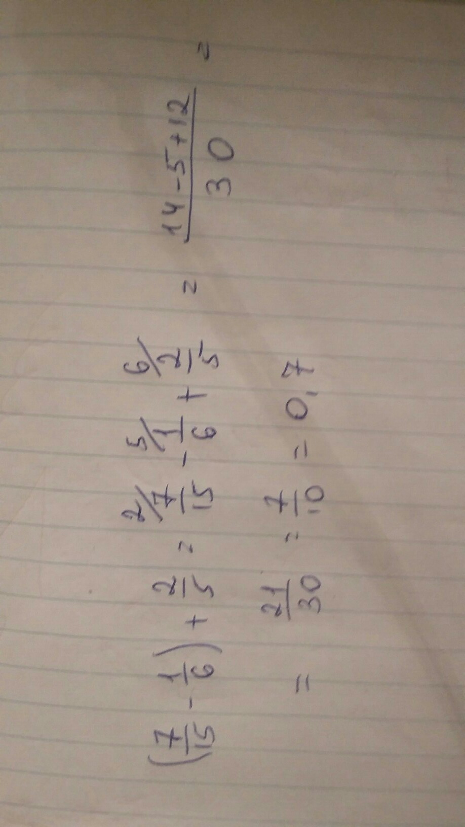 (7/15-1/6)+2/5=7/15-1/6+2/5=14/30-5/30+12/30=21/30=7/10