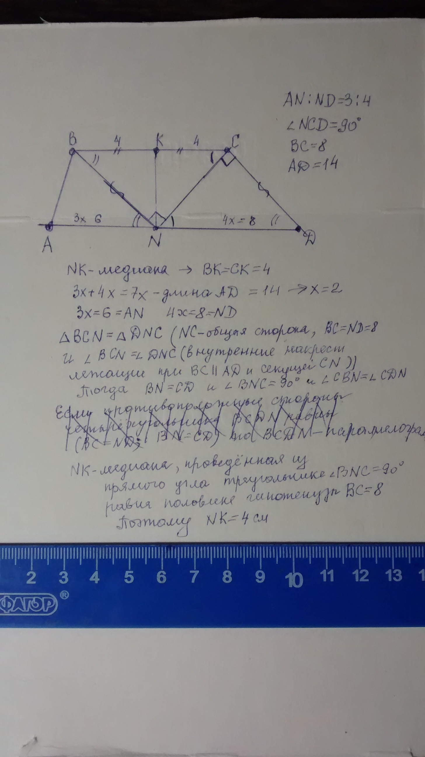 На основании AD трапеции ABCD (AD∥BC) отмечена точка N. Оказалось, что AN:ND=3:4, а ∠NCD=90