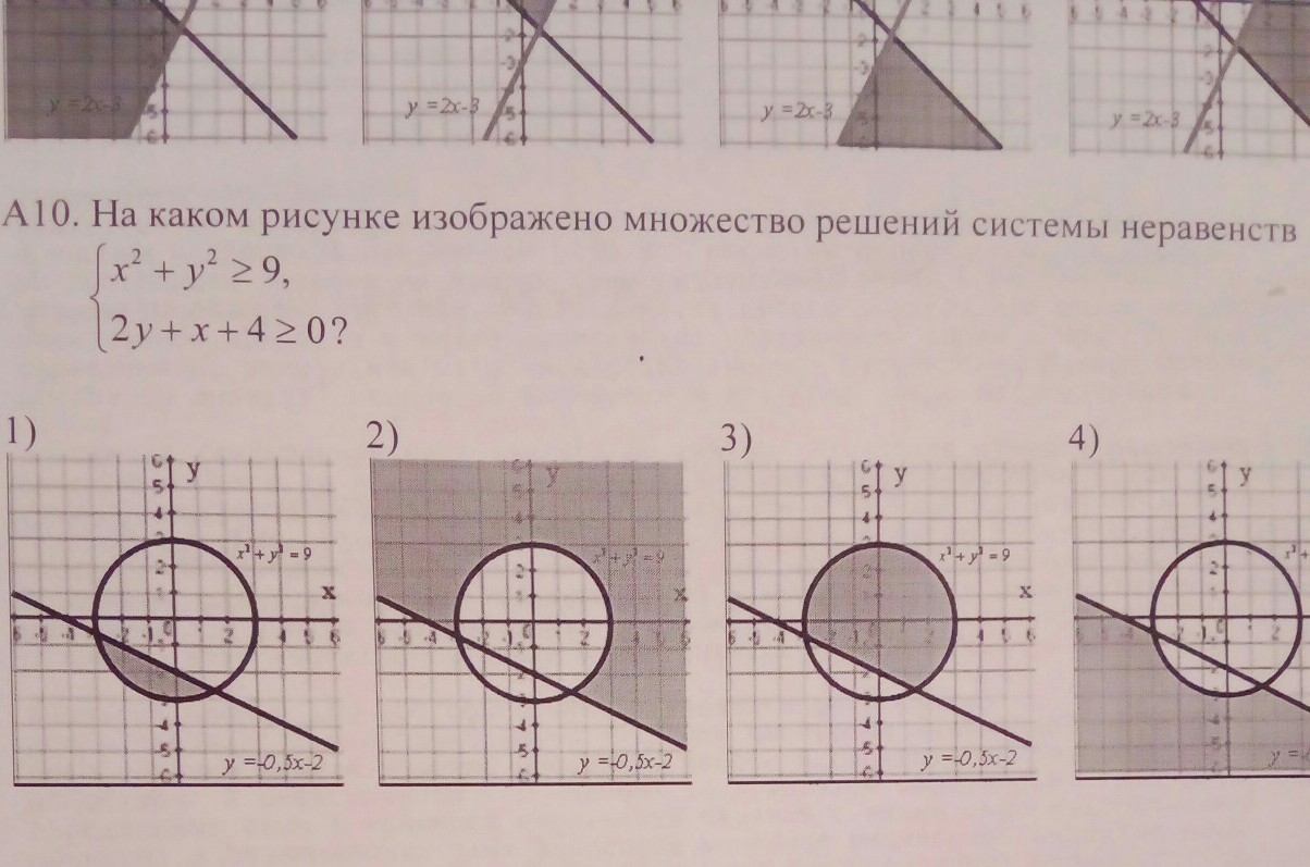 y≥-x/2-2 - этому неравенству соответствуют точки, лежащие выше прямой, т.е. вариант 2