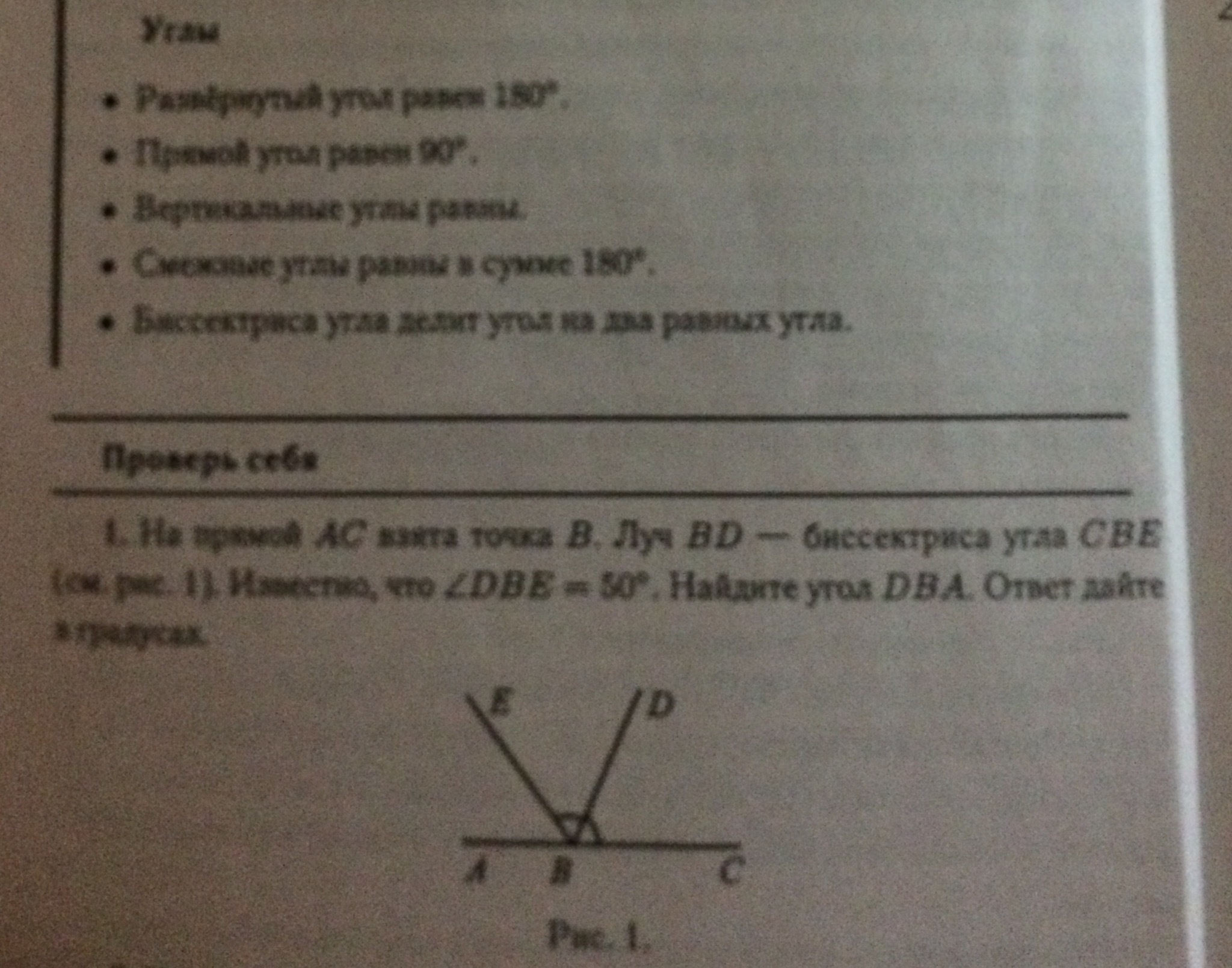 На прямой AC взята точка B. Луч BD-биссектриса угла CBE.Известно, что угол DBE=50 градусов. Найдите угол DBA. Ответ дайте в градусах.