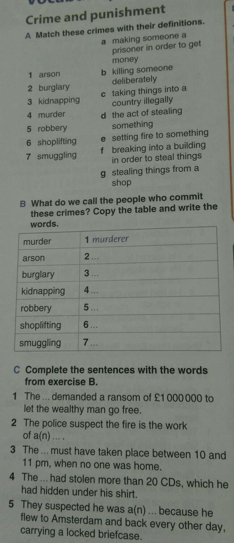 Arson -e, burglary-f,kidnapping-a, murder-b, robbery-d, shoplifting-g, smuggling-c
