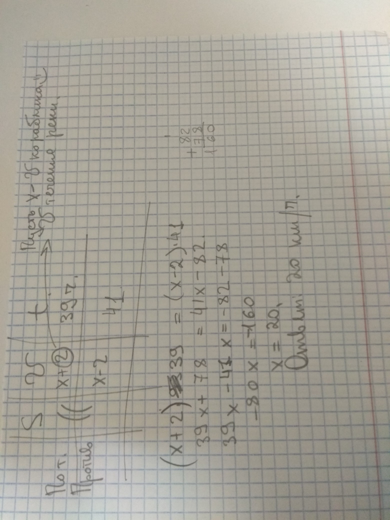 За 39 ч по течению реки теплоход проходит тот же путь, что за 41 ч против течения. Найдите собственную скорость теплохода, если скорость течения реки 2 км/ч.