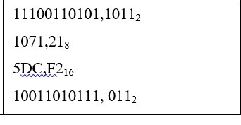 1)11100110101.1011^2 = 1·2^10+1·2^9+1·2^8+0·2^7+0·2^6+1·2^5+1·2^4+0·2^3+1·2^2+0·2^1+1·1+1·2^-1 +0·2^-2 +1·2^-3 +1·2^-4 = 1845.6875^10