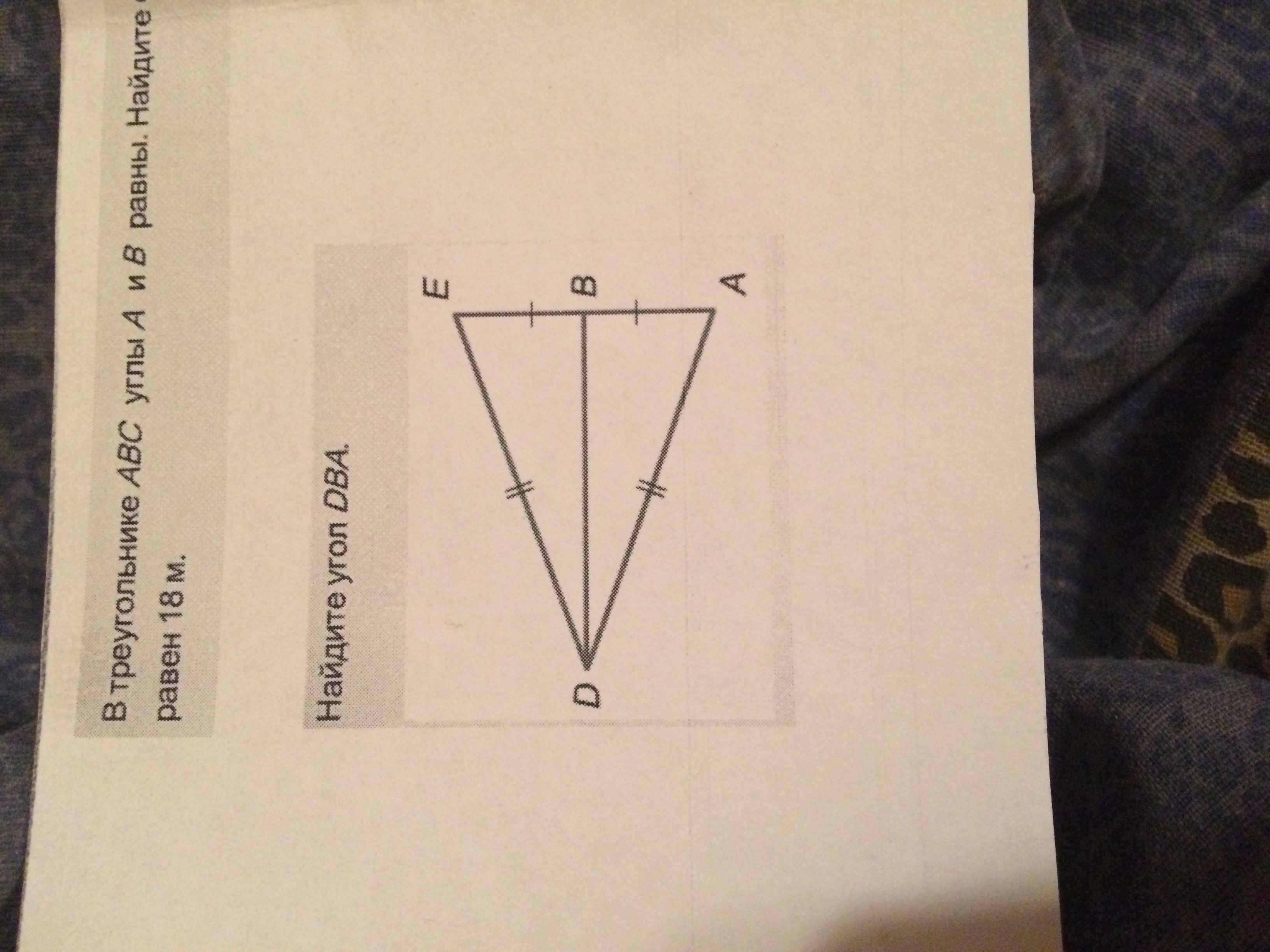 Треуг. ADE равнобедренный. Из угла D выпущена биссектриса, высота и медиана (т.к треуг. Равнобедренный) |=> треуг. ABD прямоугольный. Угол DBA - 90 градусов.
