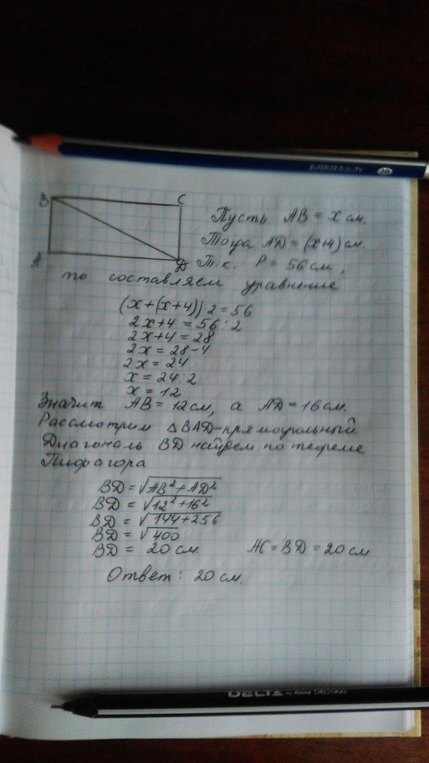 Периметр-сумма длин всех сторон,пусть одна из сторон будет x,тогда другая x+4(т.к разница 4см).Значит 2×x+2×(x+4)=56 Это и есть периметр.Найдем x.