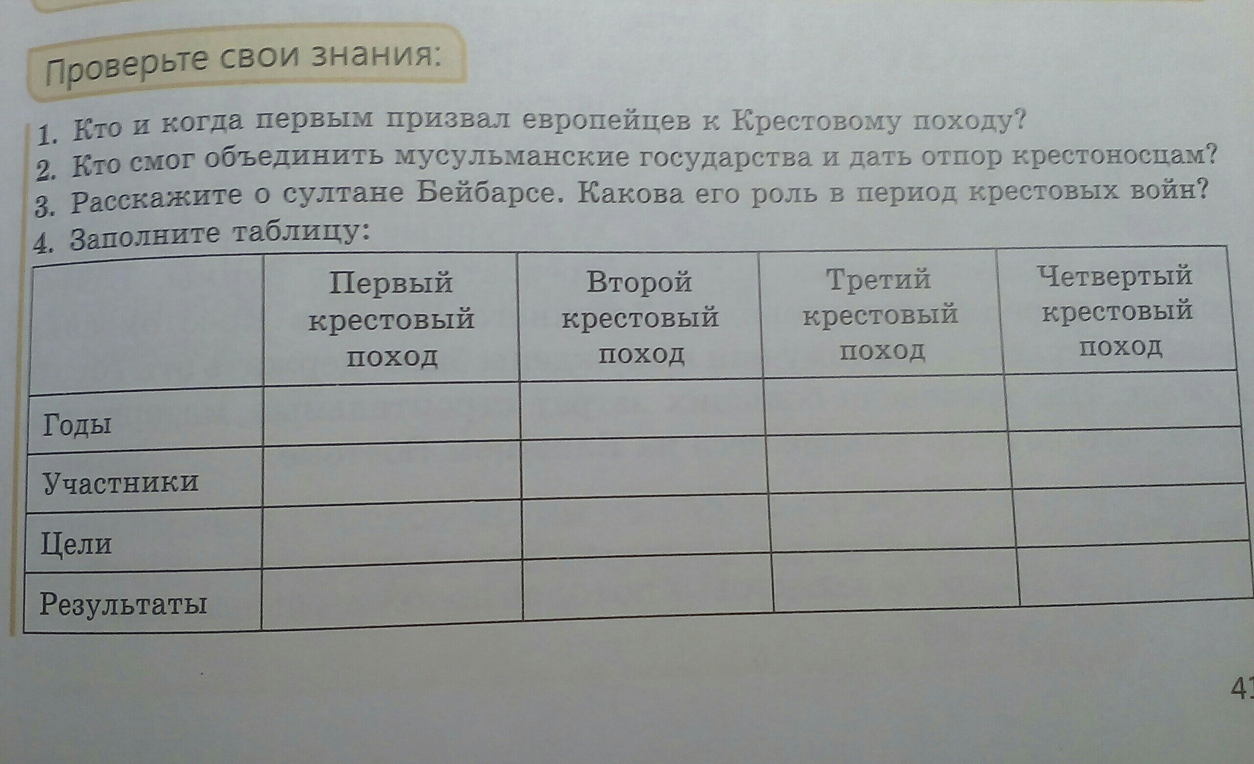 Поход Участники и организаторы Основные цели и результаты 1 крестовый поход (1096 - 1099 г г.)Организатор - папа Урбан II. Рыцари из Франции, Германии, ИталииЖелание римских пап распространить свою власть на новые страны...2 крестовый поход (1147 - 1149 гг.)Возглавляли Людовиг VII Французский и германский император Конрад IIIПотеря крестоносцами Эдессы (1144 г.). Полная неудача крестоносцев 3 крестовый поход (1189 - 1192 гг.)Возглавляли германский император Фридрих I Барбаросса...Цель похода - вернуть Иерусалим, захваченный мусульманами. потерпели...4 крестовый поход (1202 - 1204 гг.)Организатор - папа Иннокентий III. Французские, итальянские...Жестокое разграбление христианского Константинополя.Детский (1212 г.)Дети Тысячи детей погибли или были проданы в рабство 5 крестовый поход (1217 - 1221 гг.)Герцог Австрии Леопольд VI, король Венгрии Андраш II, и другие Был организован поход в Палестину и Египет. Потерпели провал...6 крестовый поход (1228 - 1229 г г.)Германский король и император Римской империи Фридрих II Штауфен 18 марта 1229 года Иерусалим в результате заключения договора.