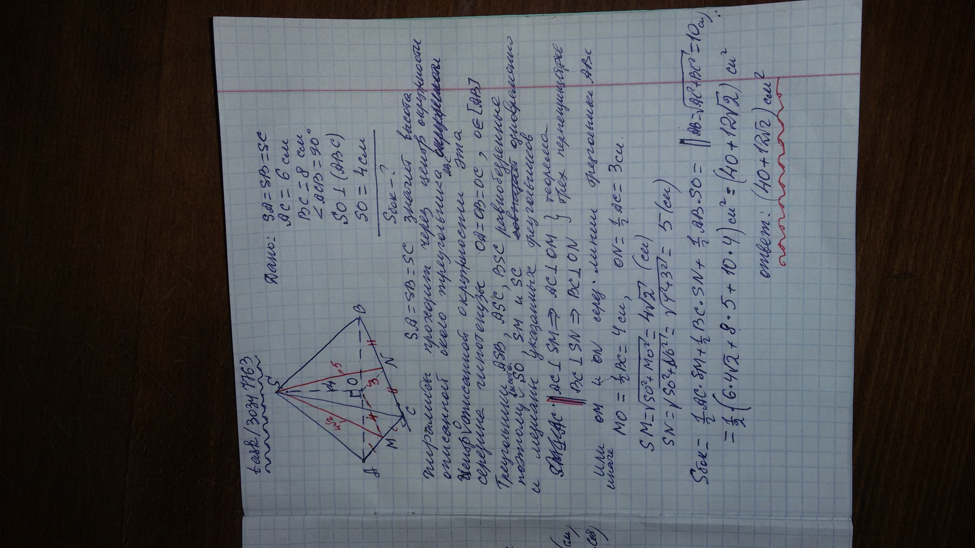 SABC - пирамида , SA=SB=SC , ∠ACB=90 , AC=6 см , CB=8 см ,SO-высота, SO=4 см . Найти:Sбок